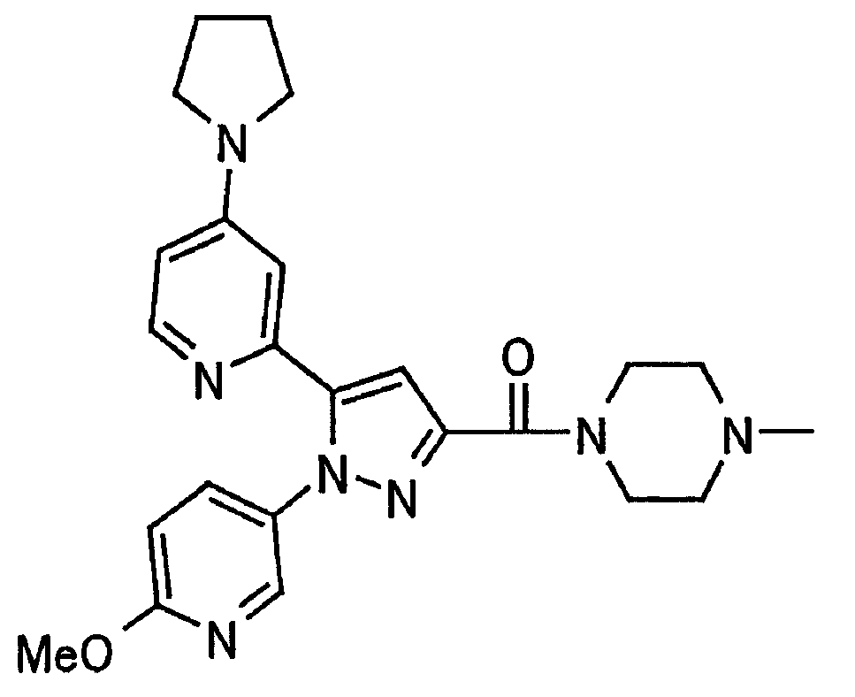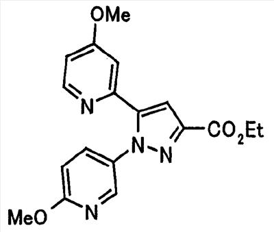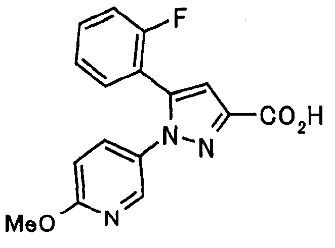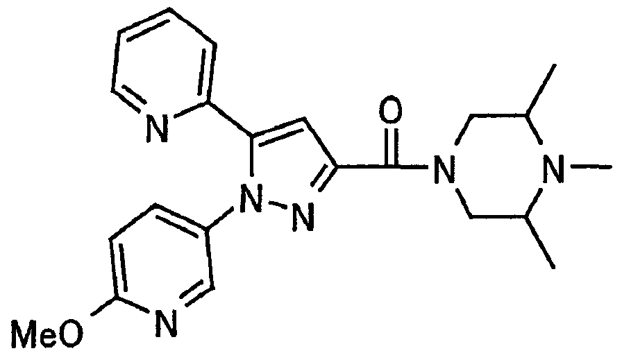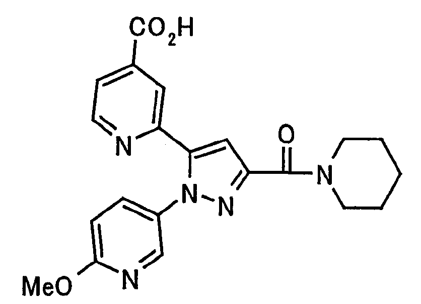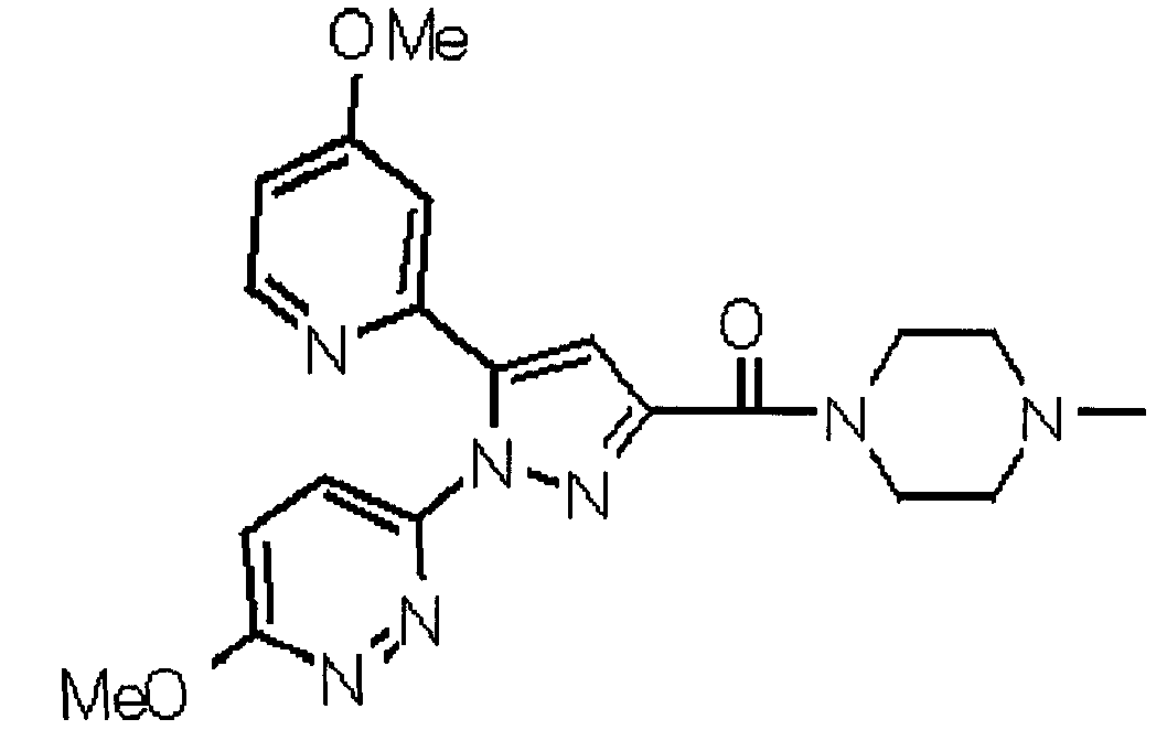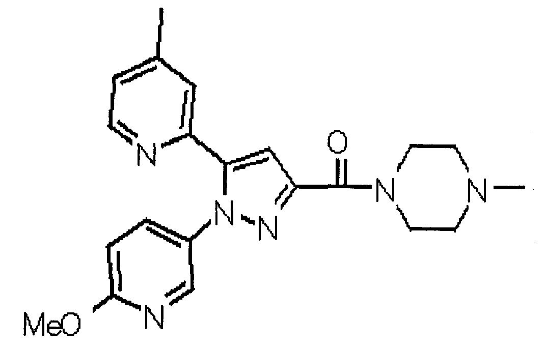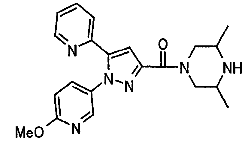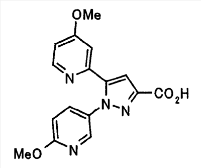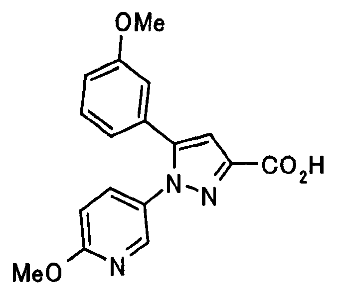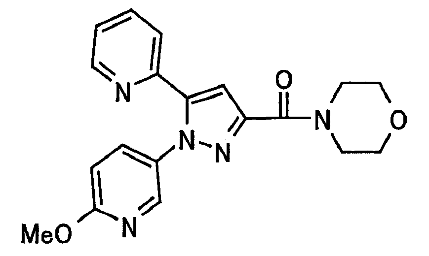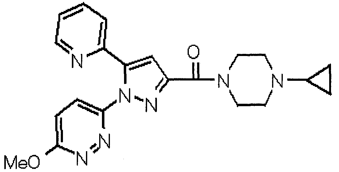 В атмосфере аргона 0,93 М метилмагнийбромид в тетрагидрофуране (13,8 мл) добавляют по каплям к 4-метоксипиридин-2-карбонитрилу (1,56 г) в тетрагидрофуране (31 мл) при -78°С с последующим перемешиванием в течение 15 минут. После этого реакционную смесь перемешивают при 0°С в течение 15 минут и затем при комнатной температуре в течение 5 часов. К реакционной смеси по каплям добавляют воду. Образовавшуюся смесь распределяют между водой и этилацетатом. Органический слой сушат над безводным сульфатом натрия с последующим фильтрованием. Растворитель выпаривают при пониженном давлении и остаток очищают колоночной хроматографией на силикагеле (гексан-этилацетат), получая при этом указанное в заголовке соединение в виде твердого вещества (1,30 г, 73%). 1H-ЯМР (400 МГц, CDCl3) МС (ESI) m/z: 152 (М+H)+. [Ссылочный пример 17] Этиловый эфир 4-(4-метокси-2-пиридил)-2,4-диоксобутановой кислоты Способом, аналогичным способу, описанному в стадии 1) ссылочного примера 3, указанное в заголовке соединение получают в виде твердого вещества (0,713 г, 33%) с применением 1-(4-метокси-2-пиридил)этанона (1,28 г) и диэтилоксалата (2,30 мл). 1H-ЯМР (400 МГц, CDCl3) МС (EI) m/z: 251 (М+). [Ссылочный пример 18] Этиловый эфир 1-(6-метокси-3-пиридил)-5-(4-метокси-2-пиридил)пиразол-3-карбоновой кислоты Способом, аналогичным способу, описанному в стадии 2) ссылочного примера 3, указанное в заголовке соединение получают в виде твердого вещества (0,473 г, 49%) с применением этилового эфира 4-(4-метокси-2-пиридил)-2,4-диоксобутановой кислоты (0,691 г), полученного в ссылочном примере 17, и 5-гидразино-2-метоксипиридина (0,383 г), полученного в ссылочном примере 2. 1H-ЯМР (400 МГц, CDCl3) МС (FAB) m/z: 355 (М+H)+. [Ссылочный пример 19] 1-(6-метокси-3-пиридил)-5-(4-метокси-2-пиридил)пиразол-3-карбоновая кислота 1 н. Водный раствор гидроксида натрия (2,23 мл) добавляют к этиловому эфиру 1-(6-метокси-3-пиридил)-5-(4-метокси-2-пиридил)пиразол-3-карбоновой кислоты (0,416 г), полученному в ссылочном примере 18, в смеси метанола (6,3 мл) и тетрагидрофурана (6,3 мл) при комнатной температуре с последующим перемешиванием в течение 5 часов. Реакционную смесь нейтрализуют 1 н. водным раствором хлористоводородной кислоты (2,23 мл) и затем распределяют между водой и хлороформом. Затем водный слой экстрагируют хлороформом два раза. Органический слой сушат над безводным сульфатом натрия с последующим фильтрованием. Растворитель выпаривают при пониженном давлении, получая при этом указанное в заголовке соединение в виде твердого вещества (0,353 г, 92%). 1Н-ЯМР (400 МГц, ДМСО-d6) МС (FAB) m/z: 327 (М+H)+. [Ссылочный пример 20] 2-Бром-6-метоксипиридин В атмосфере аргона метоксид натрия (1,82 г) добавляют к 2,6-дибромпиридину (8,0 г) в толуоле (120 мл) с последующим перемешиванием при 120°С в течение 13 часов. Затем к смеси добавляют метоксид натрия (0,728 г) с последующим перемешиванием при 120°С в течение 6 часов. Смесь охлаждают на воздухе. Реакционную смесь распределяют между водой и этилацетатом. Органический слой сушат над безводным сульфатом натрия с последующим фильтрованием. Растворитель выпаривают при пониженном давлении. Остаток очищают колоночной хроматографией на силикагеле (гексан-этилацетат), получая при этом указанное в заголовке соединение в виде маслянистого вещества (5,64 г, 89%). 1H-ЯМР (400 МГц, CDCl3) [Ссылочный пример 21] 6-Метоксипиридин-2-карбонитрил Цианид меди (I) (2,68 г) добавляют к 2-бром-6-метоксипиридину (5,62 г) в N,N-диметилформамиде (112 мл) при к