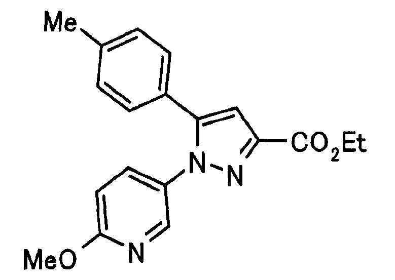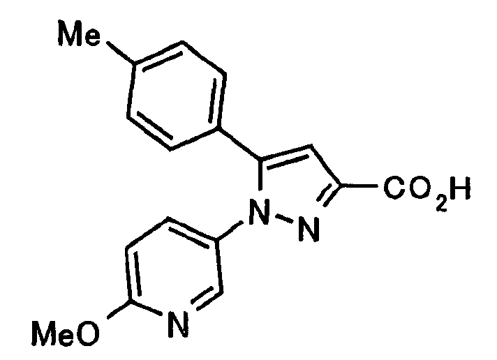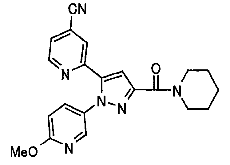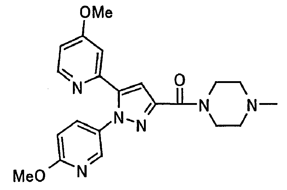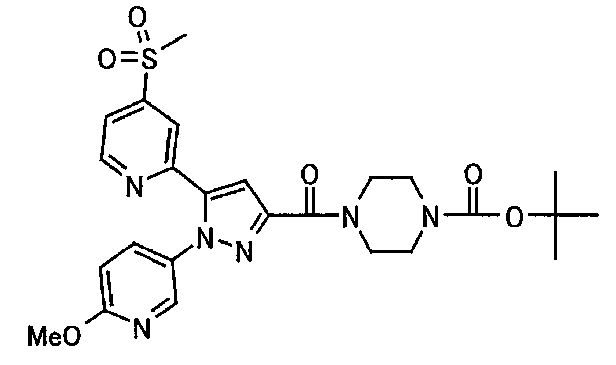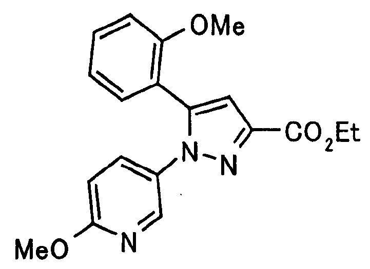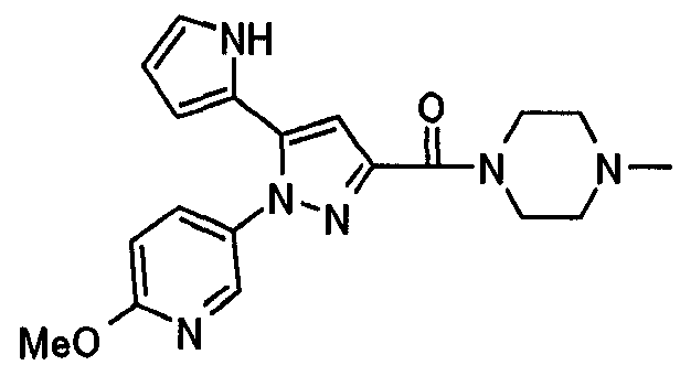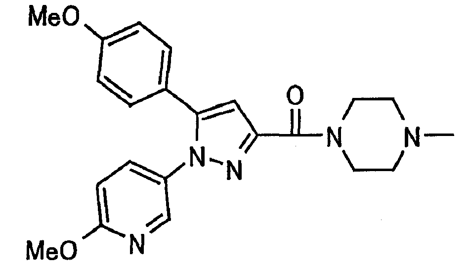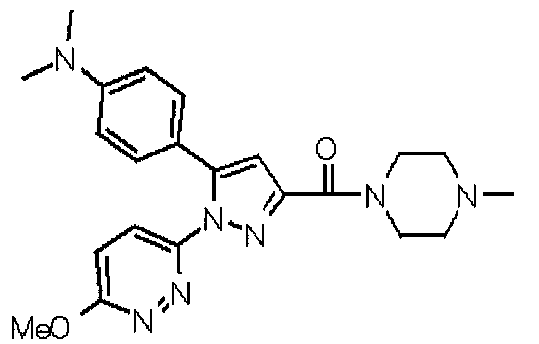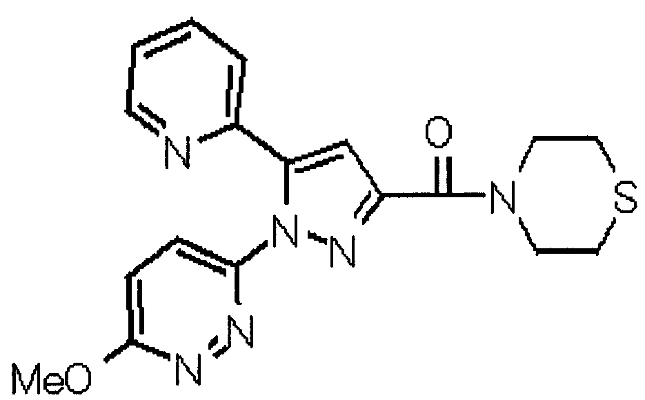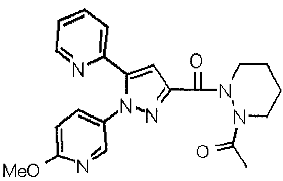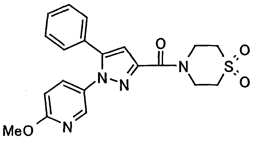 В атмосфере аргона 0,93 М метилмагнийбромид в тетрагидрофуране (13,8 мл) добавляют по каплям к 4-метоксипиридин-2-карбонитрилу (1,56 г) в тетрагидрофуране (31 мл) при -78°С с последующим перемешиванием в течение 15 минут. После этого реакционную смесь перемешивают при 0°С в течение 15 минут и затем при комнатной температуре в течение 5 часов. К реакционной смеси по каплям добавляют воду. Образовавшуюся смесь распределяют между водой и этилацетатом. Органический слой сушат над безводным сульфатом натрия с последующим фильтрованием. Растворитель выпаривают при пониженном давлении и остаток очищают колоночной хроматографией на силикагеле (гексан-этилацетат), получая при этом указанное в заголовке соединение в виде твердого вещества (1,30 г, 73%). 1H-ЯМР (400 МГц, CDCl3) МС (ESI) m/z: 152 (М+H)+. [Ссылочный пример 17] Этиловый эфир 4-(4-метокси-2-пиридил)-2,4-диоксобутановой кислоты Способом, аналогичным способу, описанному в стадии 1) ссылочного примера 3, указанное в заголовке соединение получают в виде твердого вещества (0,713 г, 33%) с применением 1-(4-метокси-2-пиридил)этанона (1,28 г) и диэтилоксалата (2,30 мл). 1H-ЯМР (400 МГц, CDCl3) МС (EI) m/z: 251 (М+). [Ссылочный пример 18] Этиловый эфир 1-(6-метокси-3-пиридил)-5-(4-метокси-2-пиридил)пиразол-3-карбоновой кислоты Способом, аналогичным способу, описанному в стадии 2) ссылочного примера 3, указанное в заголовке соединение получают в виде твердого вещества (0,473 г, 49%) с применением этилового эфира 4-(4-метокси-2-пиридил)-2,4-диоксобутановой кислоты (0,691 г), полученного в ссылочном примере 17, и 5-гидразино-2-метоксипиридина (0,383 г), полученного в ссылочном примере 2. 1H-ЯМР (400 МГц, CDCl3) МС (FAB) m/z: 355 (М+H)+. [Ссылочный пример 19] 1-(6-метокси-3-пиридил)-5-(4-метокси-2-пиридил)пиразол-3-карбоновая кислота 1 н. Водный раствор гидроксида натрия (2,23 мл) добавляют к этиловому эфиру 1-(6-метокси-3-пиридил)-5-(4-метокси-2-пиридил)пиразол-3-карбоновой кислоты (0,416 г), полученному в ссылочном примере 18, в смеси метанола (6,3 мл) и тетрагидрофурана (6,3 мл) при комнатной температуре с последующим перемешиванием в течение 5 часов. Реакционную смесь нейтрализуют 1 н. водным раствором хлористоводородной кислоты (2,23 мл) и затем распределяют между водой и хлороформом. Затем водный слой экстрагируют хлороформом два раза. Органический слой сушат над безводным сульфатом натрия с последующим фильтрованием. Растворитель выпаривают при пониженном давлении, получая при этом указанное в заголовке соединение в виде твердого вещества (0,353 г, 92%). 1Н-ЯМР (400 МГц, ДМСО-d6) МС (FAB) m/z: 327 (М+H)+. [Ссылочный пример 20] 2-Бром-6-метоксипиридин В атмосфере аргона метоксид натрия (1,82 г) добавляют к 2,6-дибромпиридину (8,0 г) в толуоле (120 мл) с последующим перемешиванием при 120°С в течение 13 часов. Затем к смеси добавляют метоксид натрия (0,728 г) с последующим перемешиванием при 120°С в течение 6 часов. Смесь охлаждают на воздухе. Реакционную смесь распределяют между водой и этилацетатом. Органический слой сушат над безводным сульфатом натрия с последующим фильтрованием. Растворитель выпаривают при пониженном давлении. Остаток очищают колоночной хроматографией на силикагеле (гексан-этилацетат), получая при этом указанное в заголовке соединение в виде маслянистого вещества (5,64 г, 89%). 1H-ЯМР (400 МГц, CDCl3) [Ссылочный пример 21] 6-Метоксипиридин-2-карбонитрил Цианид меди (I) (2,68 г) добавляют к 2-бром-6-метоксипиридину (5,62 г) в N,N-диметилформамиде (112 мл) при к