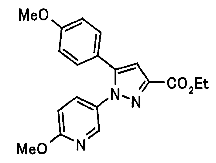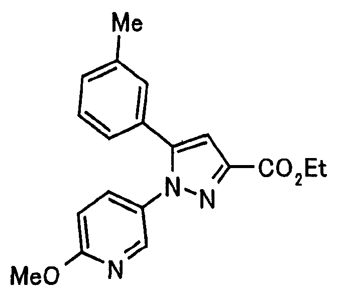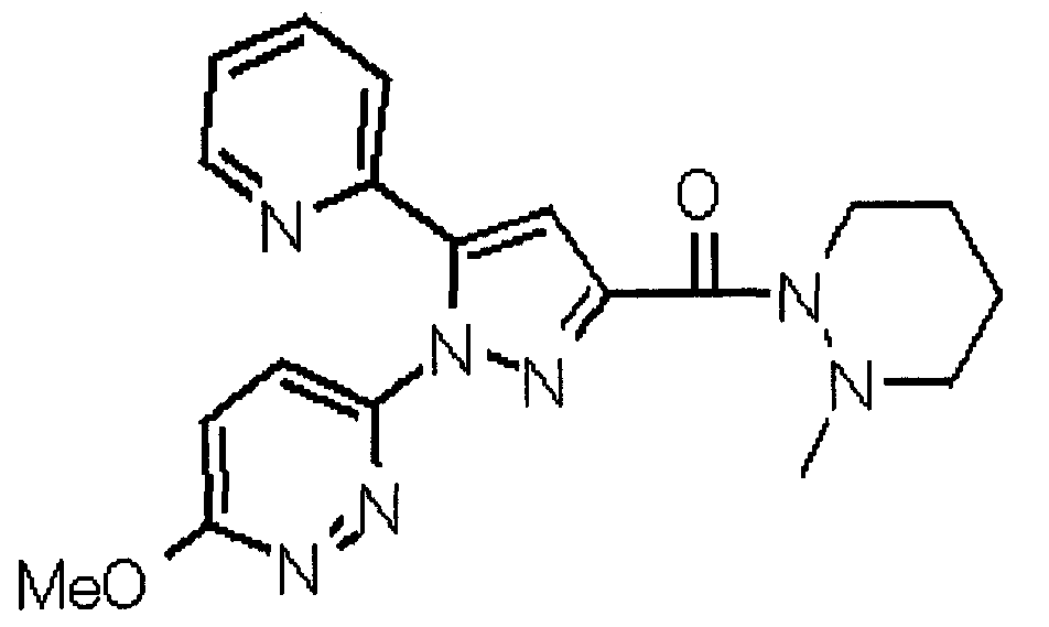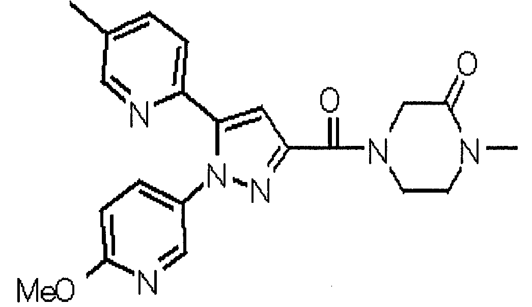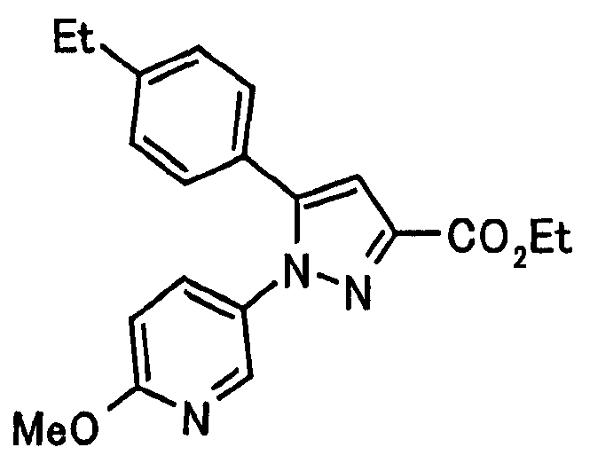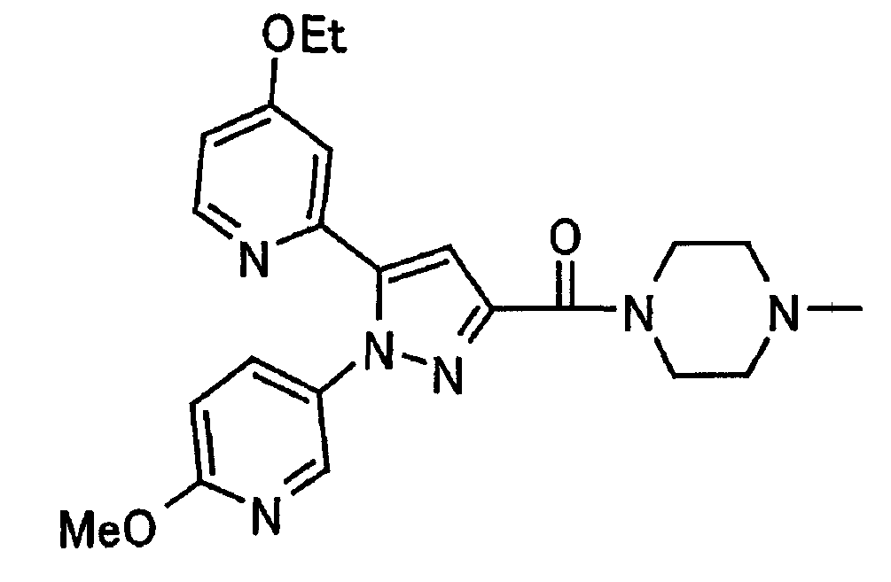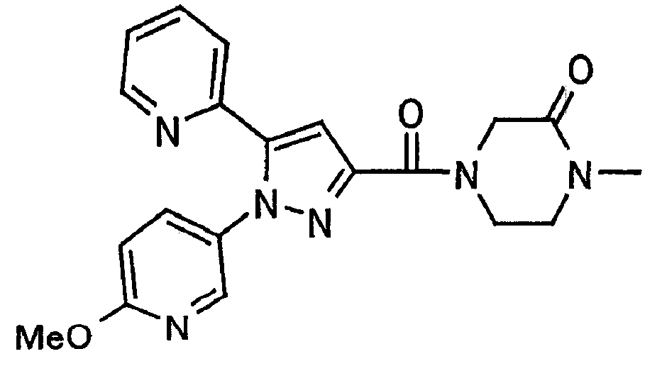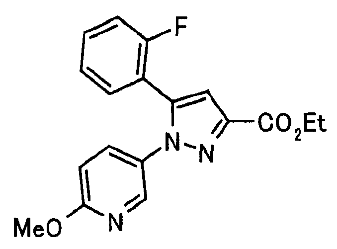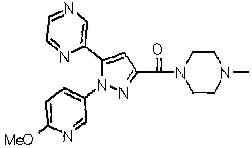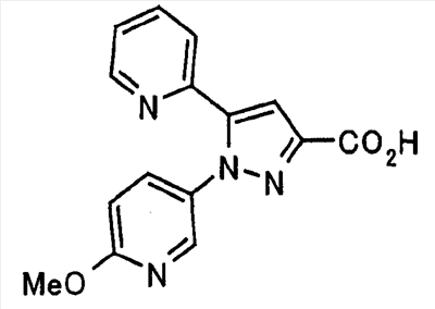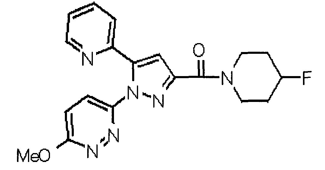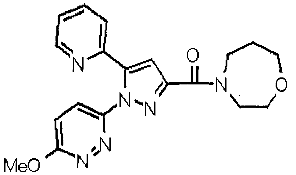 В атмосфере аргона 0,93 М метилмагнийбромид в тетрагидрофуране (13,8 мл) добавляют по каплям к 4-метоксипиридин-2-карбонитрилу (1,56 г) в тетрагидрофуране (31 мл) при -78°С с последующим перемешиванием в течение 15 минут. После этого реакционную смесь перемешивают при 0°С в течение 15 минут и затем при комнатной температуре в течение 5 часов. К реакционной смеси по каплям добавляют воду. Образовавшуюся смесь распределяют между водой и этилацетатом. Органический слой сушат над безводным сульфатом натрия с последующим фильтрованием. Растворитель выпаривают при пониженном давлении и остаток очищают колоночной хроматографией на силикагеле (гексан-этилацетат), получая при этом указанное в заголовке соединение в виде твердого вещества (1,30 г, 73%). 1H-ЯМР (400 МГц, CDCl3) МС (ESI) m/z: 152 (М+H)+. [Ссылочный пример 17] Этиловый эфир 4-(4-метокси-2-пиридил)-2,4-диоксобутановой кислоты Способом, аналогичным способу, описанному в стадии 1) ссылочного примера 3, указанное в заголовке соединение получают в виде твердого вещества (0,713 г, 33%) с применением 1-(4-метокси-2-пиридил)этанона (1,28 г) и диэтилоксалата (2,30 мл). 1H-ЯМР (400 МГц, CDCl3) МС (EI) m/z: 251 (М+). [Ссылочный пример 18] Этиловый эфир 1-(6-метокси-3-пиридил)-5-(4-метокси-2-пиридил)пиразол-3-карбоновой кислоты Способом, аналогичным способу, описанному в стадии 2) ссылочного примера 3, указанное в заголовке соединение получают в виде твердого вещества (0,473 г, 49%) с применением этилового эфира 4-(4-метокси-2-пиридил)-2,4-диоксобутановой кислоты (0,691 г), полученного в ссылочном примере 17, и 5-гидразино-2-метоксипиридина (0,383 г), полученного в ссылочном примере 2. 1H-ЯМР (400 МГц, CDCl3) МС (FAB) m/z: 355 (М+H)+. [Ссылочный пример 19] 1-(6-метокси-3-пиридил)-5-(4-метокси-2-пиридил)пиразол-3-карбоновая кислота 1 н. Водный раствор гидроксида натрия (2,23 мл) добавляют к этиловому эфиру 1-(6-метокси-3-пиридил)-5-(4-метокси-2-пиридил)пиразол-3-карбоновой кислоты (0,416 г), полученному в ссылочном примере 18, в смеси метанола (6,3 мл) и тетрагидрофурана (6,3 мл) при комнатной температуре с последующим перемешиванием в течение 5 часов. Реакционную смесь нейтрализуют 1 н. водным раствором хлористоводородной кислоты (2,23 мл) и затем распределяют между водой и хлороформом. Затем водный слой экстрагируют хлороформом два раза. Органический слой сушат над безводным сульфатом натрия с последующим фильтрованием. Растворитель выпаривают при пониженном давлении, получая при этом указанное в заголовке соединение в виде твердого вещества (0,353 г, 92%). 1Н-ЯМР (400 МГц, ДМСО-d6) МС (FAB) m/z: 327 (М+H)+. [Ссылочный пример 20] 2-Бром-6-метоксипиридин В атмосфере аргона метоксид натрия (1,82 г) добавляют к 2,6-дибромпиридину (8,0 г) в толуоле (120 мл) с последующим перемешиванием при 120°С в течение 13 часов. Затем к смеси добавляют метоксид натрия (0,728 г) с последующим перемешиванием при 120°С в течение 6 часов. Смесь охлаждают на воздухе. Реакционную смесь распределяют между водой и этилацетатом. Органический слой сушат над безводным сульфатом натрия с последующим фильтрованием. Растворитель выпаривают при пониженном давлении. Остаток очищают колоночной хроматографией на силикагеле (гексан-этилацетат), получая при этом указанное в заголовке соединение в виде маслянистого вещества (5,64 г, 89%). 1H-ЯМР (400 МГц, CDCl3) [Ссылочный пример 21] 6-Метоксипиридин-2-карбонитрил Цианид меди (I) (2,68 г) добавляют к 2-бром-6-метоксипиридину (5,62 г) в N,N-диметилформамиде (112 мл) при к