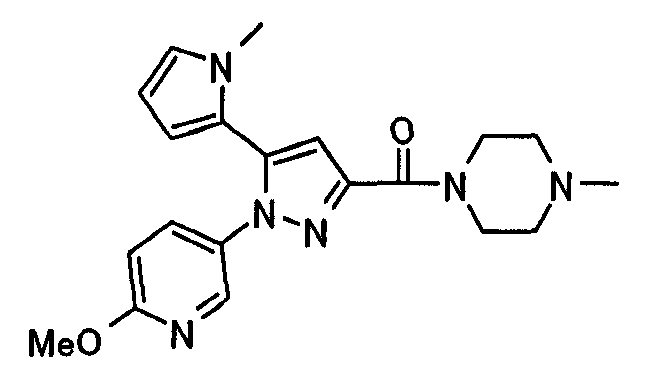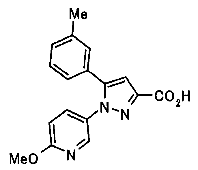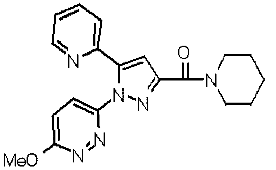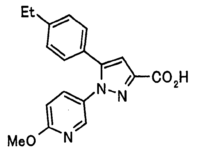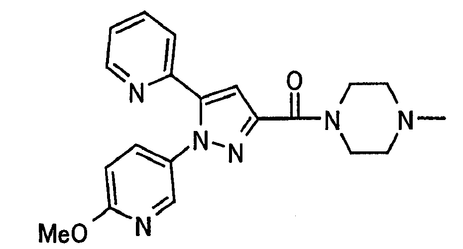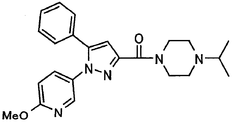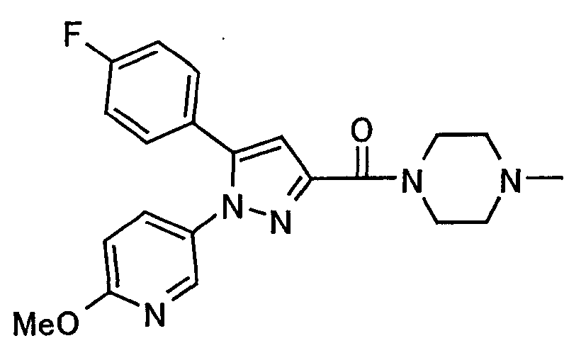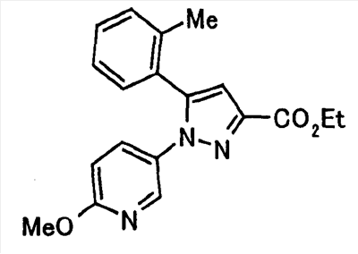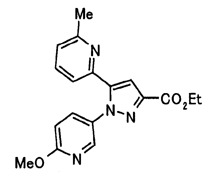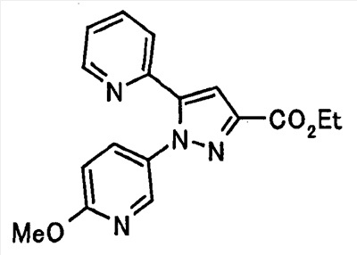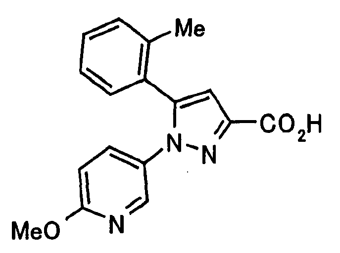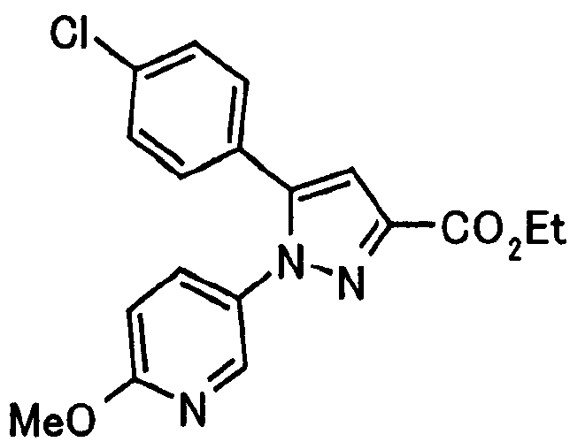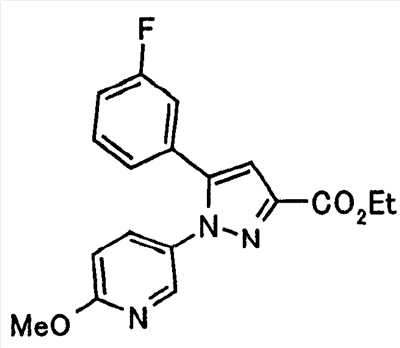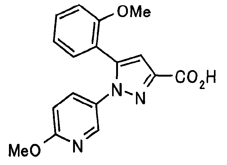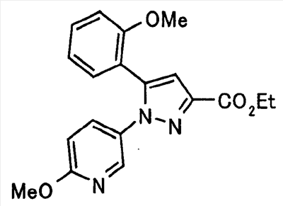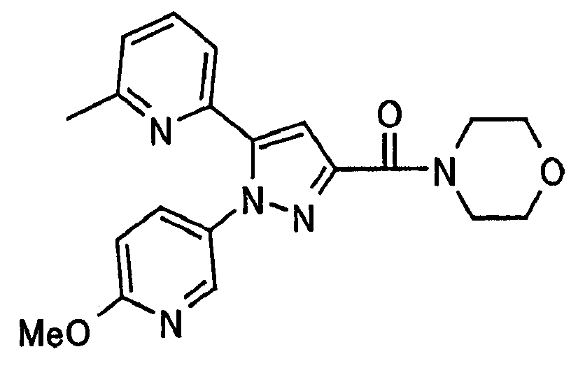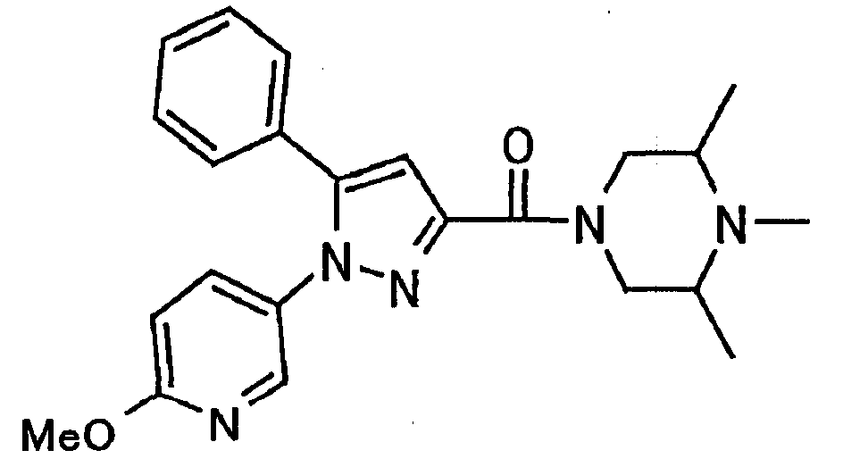 В атмосфере аргона 0,93 М метилмагнийбромид в тетрагидрофуране (13,8 мл) добавляют по каплям к 4-метоксипиридин-2-карбонитрилу (1,56 г) в тетрагидрофуране (31 мл) при -78°С с последующим перемешиванием в течение 15 минут. После этого реакционную смесь перемешивают при 0°С в течение 15 минут и затем при комнатной температуре в течение 5 часов. К реакционной смеси по каплям добавляют воду. Образовавшуюся смесь распределяют между водой и этилацетатом. Органический слой сушат над безводным сульфатом натрия с последующим фильтрованием. Растворитель выпаривают при пониженном давлении и остаток очищают колоночной хроматографией на силикагеле (гексан-этилацетат), получая при этом указанное в заголовке соединение в виде твердого вещества (1,30 г, 73%). 1H-ЯМР (400 МГц, CDCl3) МС (ESI) m/z: 152 (М+H)+. [Ссылочный пример 17] Этиловый эфир 4-(4-метокси-2-пиридил)-2,4-диоксобутановой кислоты Способом, аналогичным способу, описанному в стадии 1) ссылочного примера 3, указанное в заголовке соединение получают в виде твердого вещества (0,713 г, 33%) с применением 1-(4-метокси-2-пиридил)этанона (1,28 г) и диэтилоксалата (2,30 мл). 1H-ЯМР (400 МГц, CDCl3) МС (EI) m/z: 251 (М+). [Ссылочный пример 18] Этиловый эфир 1-(6-метокси-3-пиридил)-5-(4-метокси-2-пиридил)пиразол-3-карбоновой кислоты Способом, аналогичным способу, описанному в стадии 2) ссылочного примера 3, указанное в заголовке соединение получают в виде твердого вещества (0,473 г, 49%) с применением этилового эфира 4-(4-метокси-2-пиридил)-2,4-диоксобутановой кислоты (0,691 г), полученного в ссылочном примере 17, и 5-гидразино-2-метоксипиридина (0,383 г), полученного в ссылочном примере 2. 1H-ЯМР (400 МГц, CDCl3) МС (FAB) m/z: 355 (М+H)+. [Ссылочный пример 19] 1-(6-метокси-3-пиридил)-5-(4-метокси-2-пиридил)пиразол-3-карбоновая кислота 1 н. Водный раствор гидроксида натрия (2,23 мл) добавляют к этиловому эфиру 1-(6-метокси-3-пиридил)-5-(4-метокси-2-пиридил)пиразол-3-карбоновой кислоты (0,416 г), полученному в ссылочном примере 18, в смеси метанола (6,3 мл) и тетрагидрофурана (6,3 мл) при комнатной температуре с последующим перемешиванием в течение 5 часов. Реакционную смесь нейтрализуют 1 н. водным раствором хлористоводородной кислоты (2,23 мл) и затем распределяют между водой и хлороформом. Затем водный слой экстрагируют хлороформом два раза. Органический слой сушат над безводным сульфатом натрия с последующим фильтрованием. Растворитель выпаривают при пониженном давлении, получая при этом указанное в заголовке соединение в виде твердого вещества (0,353 г, 92%). 1Н-ЯМР (400 МГц, ДМСО-d6) МС (FAB) m/z: 327 (М+H)+. [Ссылочный пример 20] 2-Бром-6-метоксипиридин В атмосфере аргона метоксид натрия (1,82 г) добавляют к 2,6-дибромпиридину (8,0 г) в толуоле (120 мл) с последующим перемешиванием при 120°С в течение 13 часов. Затем к смеси добавляют метоксид натрия (0,728 г) с последующим перемешиванием при 120°С в течение 6 часов. Смесь охлаждают на воздухе. Реакционную смесь распределяют между водой и этилацетатом. Органический слой сушат над безводным сульфатом натрия с последующим фильтрованием. Растворитель выпаривают при пониженном давлении. Остаток очищают колоночной хроматографией на силикагеле (гексан-этилацетат), получая при этом указанное в заголовке соединение в виде маслянистого вещества (5,64 г, 89%). 1H-ЯМР (400 МГц, CDCl3) [Ссылочный пример 21] 6-Метоксипиридин-2-карбонитрил Цианид меди (I) (2,68 г) добавляют к 2-бром-6-метоксипиридину (5,62 г) в N,N-диметилформамиде (112 мл) при к