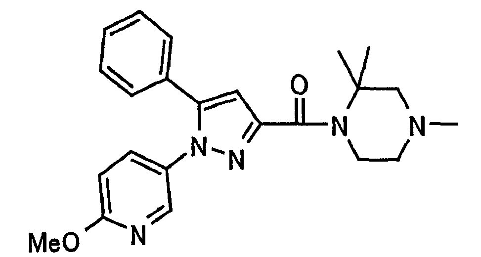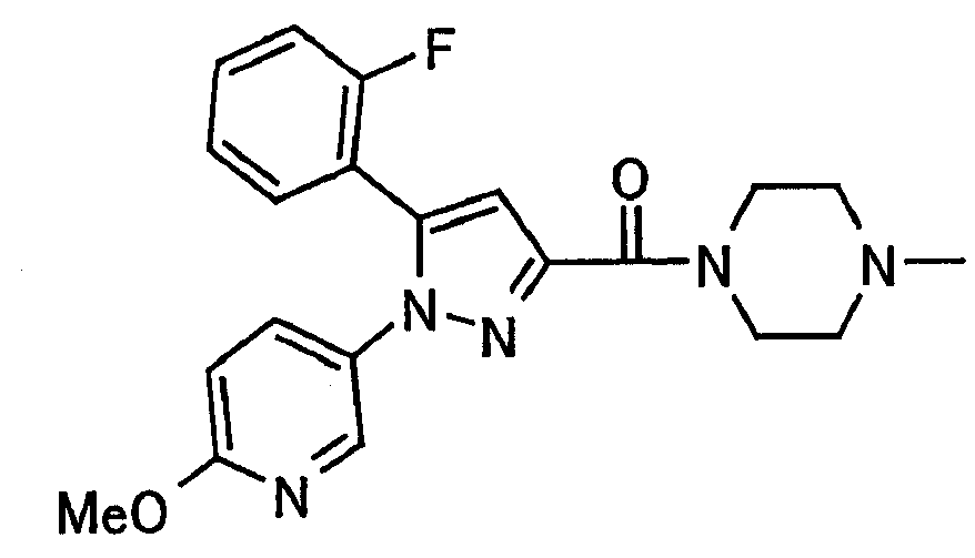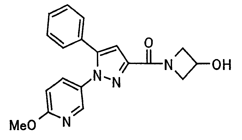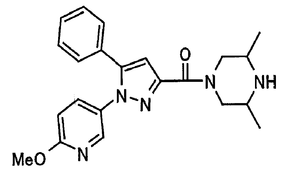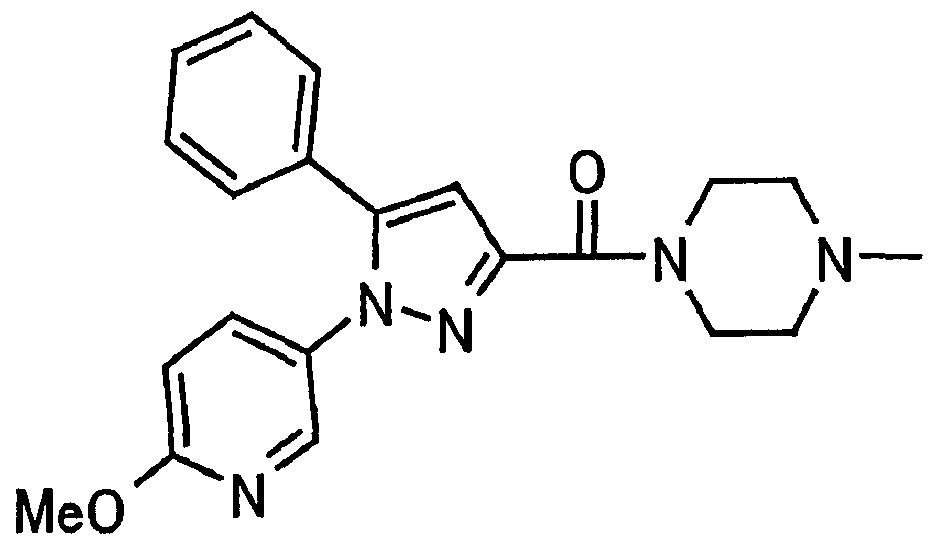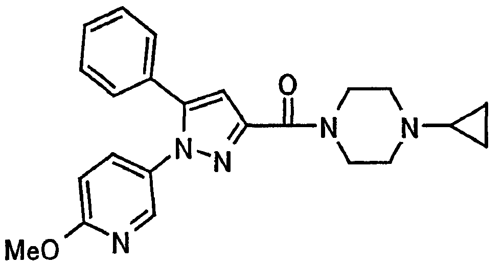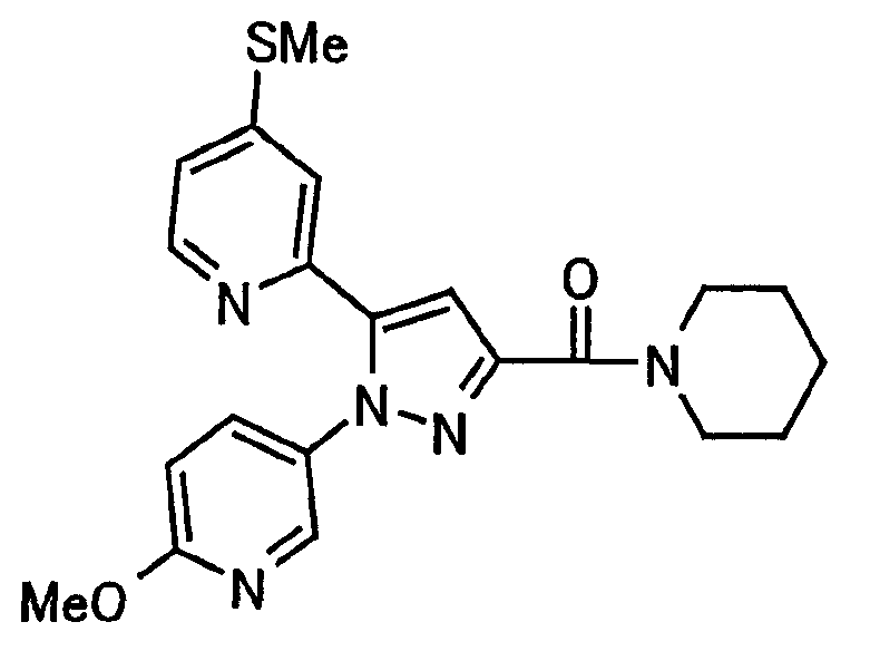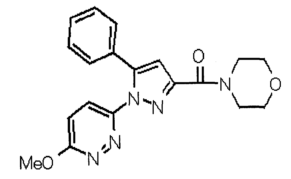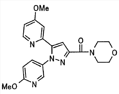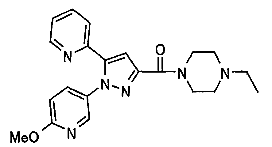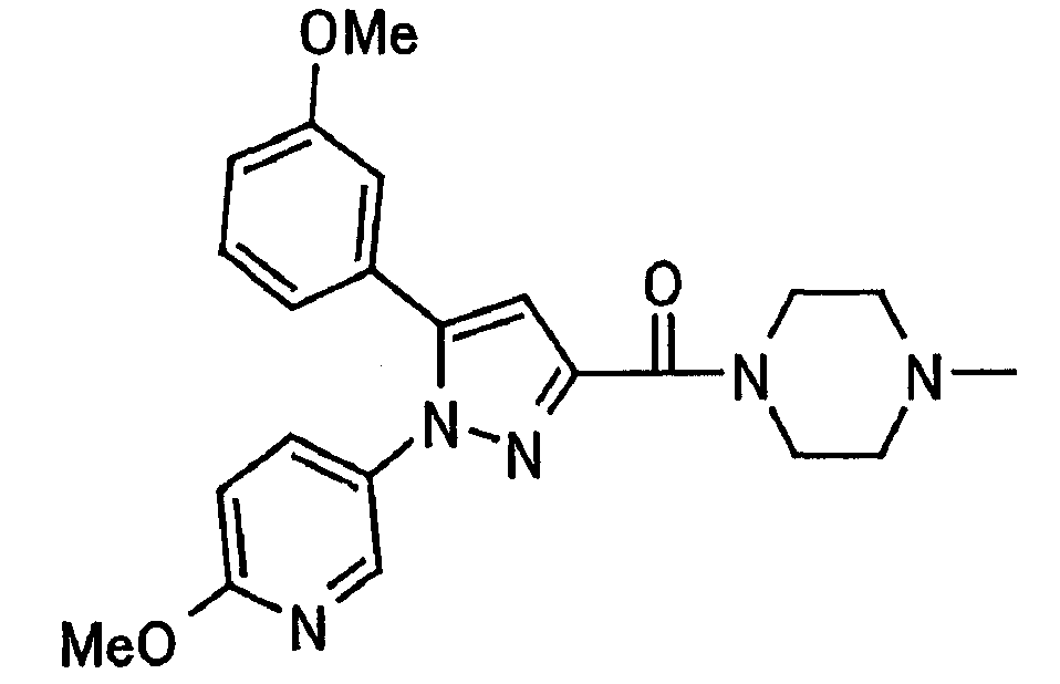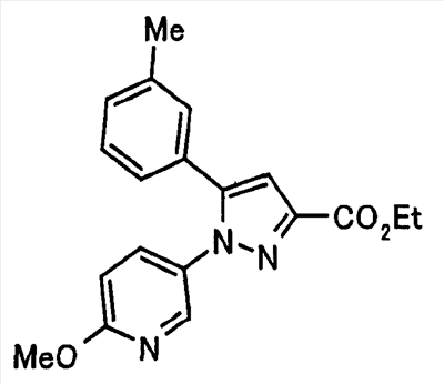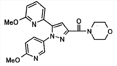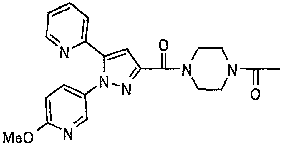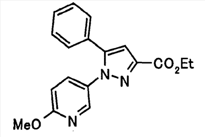В атмосфере аргона 0,93 М метилмагнийбромид в тетрагидрофуране (13,8 мл) добавляют по каплям к 4-метоксипиридин-2-карбонитрилу (1,56 г) в тетрагидрофуране (31 мл) при -78°С с последующим перемешиванием в течение 15 минут. После этого реакционную смесь перемешивают при 0°С в течение 15 минут и затем при комнатной температуре в течение 5 часов. К реакционной смеси по каплям добавляют воду. Образовавшуюся смесь распределяют между водой и этилацетатом. Органический слой сушат над безводным сульфатом натрия с последующим фильтрованием. Растворитель выпаривают при пониженном давлении и остаток очищают колоночной хроматографией на силикагеле (гексан-этилацетат), получая при этом указанное в заголовке соединение в виде твердого вещества (1,30 г, 73%). 1H-ЯМР (400 МГц, CDCl3) МС (ESI) m/z: 152 (М+H)+. [Ссылочный пример 17] Этиловый эфир 4-(4-метокси-2-пиридил)-2,4-диоксобутановой кислоты Способом, аналогичным способу, описанному в стадии 1) ссылочного примера 3, указанное в заголовке соединение получают в виде твердого вещества (0,713 г, 33%) с применением 1-(4-метокси-2-пиридил)этанона (1,28 г) и диэтилоксалата (2,30 мл). 1H-ЯМР (400 МГц, CDCl3) МС (EI) m/z: 251 (М+). [Ссылочный пример 18] Этиловый эфир 1-(6-метокси-3-пиридил)-5-(4-метокси-2-пиридил)пиразол-3-карбоновой кислоты Способом, аналогичным способу, описанному в стадии 2) ссылочного примера 3, указанное в заголовке соединение получают в виде твердого вещества (0,473 г, 49%) с применением этилового эфира 4-(4-метокси-2-пиридил)-2,4-диоксобутановой кислоты (0,691 г), полученного в ссылочном примере 17, и 5-гидразино-2-метоксипиридина (0,383 г), полученного в ссылочном примере 2. 1H-ЯМР (400 МГц, CDCl3) МС (FAB) m/z: 355 (М+H)+. [Ссылочный пример 19] 1-(6-метокси-3-пиридил)-5-(4-метокси-2-пиридил)пиразол-3-карбоновая кислота 1 н. Водный раствор гидроксида натрия (2,23 мл) добавляют к этиловому эфиру 1-(6-метокси-3-пиридил)-5-(4-метокси-2-пиридил)пиразол-3-карбоновой кислоты (0,416 г), полученному в ссылочном примере 18, в смеси метанола (6,3 мл) и тетрагидрофурана (6,3 мл) при комнатной температуре с последующим перемешиванием в течение 5 часов. Реакционную смесь нейтрализуют 1 н. водным раствором хлористоводородной кислоты (2,23 мл) и затем распределяют между водой и хлороформом. Затем водный слой экстрагируют хлороформом два раза. Органический слой сушат над безводным сульфатом натрия с последующим фильтрованием. Растворитель выпаривают при пониженном давлении, получая при этом указанное в заголовке соединение в виде твердого вещества (0,353 г, 92%). 1Н-ЯМР (400 МГц, ДМСО-d6) МС (FAB) m/z: 327 (М+H)+. [Ссылочный пример 20] 2-Бром-6-метоксипиридин В атмосфере аргона метоксид натрия (1,82 г) добавляют к 2,6-дибромпиридину (8,0 г) в толуоле (120 мл) с последующим перемешиванием при 120°С в течение 13 часов. Затем к смеси добавляют метоксид натрия (0,728 г) с последующим перемешиванием при 120°С в течение 6 часов. Смесь охлаждают на воздухе. Реакционную смесь распределяют между водой и этилацетатом. Органический слой сушат над безводным сульфатом натрия с последующим фильтрованием. Растворитель выпаривают при пониженном давлении. Остаток очищают колоночной хроматографией на силикагеле (гексан-этилацетат), получая при этом указанное в заголовке соединение в виде маслянистого вещества (5,64 г, 89%). 1H-ЯМР (400 МГц, CDCl3) [Ссылочный пример 21] 6-Метоксипиридин-2-карбонитрил Цианид меди (I) (2,68 г) добавляют к 2-бром-6-метоксипиридину (5,62 г) в N,N-диметилформамиде (112 мл) при к