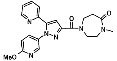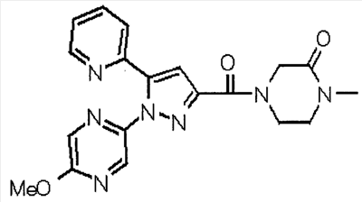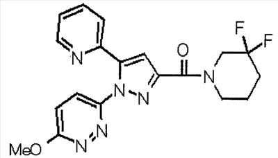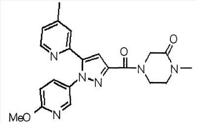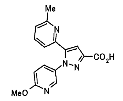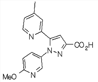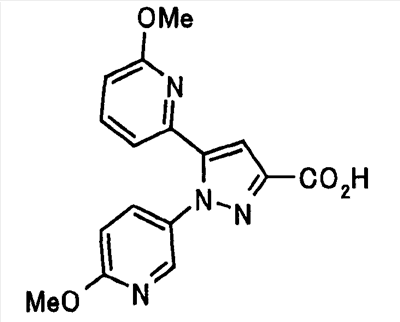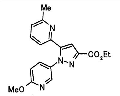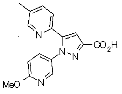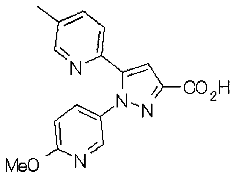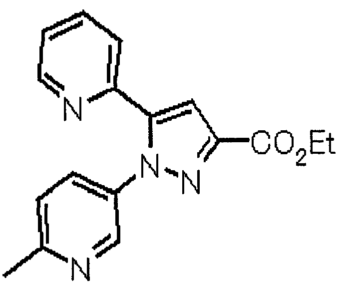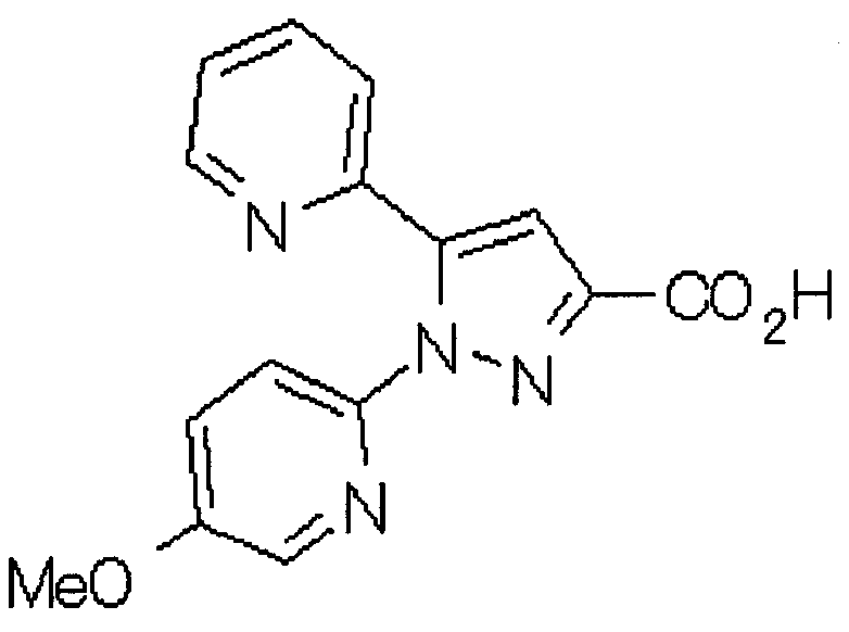 Способом, аналогичным способу, описанному в ссылочном примере 16, указанное в заголовке соединение получают в виде твердого вещества (0,819 г, 42%) с применением 6-метоксипиридин-2-карбонитрила (1,75 г). 1H-ЯМР (400 МГц, CDCl3) МС (ESI) m/z: 152 (М+H)+. [Ссылочный пример 23] Этиловый эфир 4-(6-метокси-2-пиридил)-2,4-диоксобутановой кислоты Способом, аналогичным способу, описанному в стадии 1) ссылочного примера 3, указанное в заголовке соединение получают в виде маслянистого вещества (1,16 г, 87%) с применением 1-(6-метокси-2-пиридил)этанона (0,80 г) и диэтилоксалата (1,44 мл). 1H-ЯМР (400 МГц, CDCl3) МС (EI) m/z: 251 (М+). [Ссылочный пример 24] Этиловый эфир 1-(6-метокси-3-пиридил)-5-(6-метокси-2-пиридил)пиразол-3-карбоновой кислоты Способом, аналогичным способу, описанному в стадии 2) ссылочного примера 3, указанное в заголовке соединение получают в виде маслянистого вещества (0,740 г, 46%) с применением этилового эфира 4-(6-метокси-2-пиридил)-2,4-диоксобутановой кислоты (1,15 г), полученного в ссылочном примере 23, и 5-гидразино-2-метоксипиридина (0,637 г), полученного в ссылочном примере 2. 1H-ЯМР (400 МГц, CDCl3) МС (EI) m/z: 354 (М+). [Ссылочный пример 25] 1-(6-Метокси-3-пиридил)-5-(6-метокси-2-пиридил)пиразол-3-карбоновая кислота Способом, аналогичным способу, описанному в ссылочном примере 19, указанное в заголовке соединение получают в виде твердого вещества (0,584 г 91%) с применением этилового эфира производного пиразол-3-карбоновой кислоты (0,694 г), полученного в ссылочном эфире 24. 1H-ЯМР (400 МГц, CDCl3) МС (FAB) m/z: 327 (М+1)+. [Ссылочный пример 26] 6-Метилпиридин-2-карбонитрил Способом, аналогичным способу, описанному в ссылочном пример 21, указанное в заголовке соединение получают в виде твердого вещества (2,81 г, 41%) с применением 2-бром-6-пиколина (9,87 г) и цианида меди (I) (5,14 г). 1H-ЯМР (400 МГц, CDCl3) МС (EI) m/z: 118 (М+). [Ссылочный пример 27] 1-(6-Метил-2-пиридил)этанон Способом, аналогичным способу, описанному в ссылочном примере 16, указанное в заголовке соединение получают в виде маслянистого вещества (1,04 г, 33%) с применением 6-метилпиридин-2-карбонитрила (2,80 г) и 0,93 М метилмагнийбромида в тетрагидрофуране (28,0 мл). 1H-ЯМР (400 МГц, CDCl3) МС (FAB) m/z: 136 (М+H)+. [Ссылочный пример 28] Этиловый эфир 4-(6-метил-2-пиридил)-2,4-диоксобутановой кислоты Способом, аналогичным способу, описанному в стадии 1) ссылочного примера 3, указанное в заголовке соединение получают в виде маслянистого вещества (0,443 г, 25%) с применением 1-(6-метил-2-пиридил)этанона (1,03 г) и диэтилоксалата (2,07 мл). 1H-ЯМР (400 МГц, CDCl3) МС (EI) m/z: 235 (М+). [Ссылочный пример 29] Этиловый эфир 1-(6-метокси-3-пиридил)-5-(6-метил-2-пиридил)пиразол-3-карбоновой кислоты Способом, аналогичным способу, описанному в стадии 2) ссылочного примера 3, указанное в заголовке соединение получают в виде маслянистого вещества (0,491 г, 79%) с применением этилового эфира 4-(6-метил-2-пиридил)-2,4-диоксобутановой кислоты (0,431 г), полученного в ссылочном примере 28, и 5-гидразино-2-метоксипиридина (0,255 г), полученного в ссылочном примере 2. 1H-ЯМР (400 МГц, CDCl3) МС (FAB) m/z: 339 (М+). [Ссылочный пример 30] 1-(6-Метокси-3-пиридил)-5-(6-метил-2-пиридил)пиразол-3-карбоновая кислота Способом, аналогичным способу, описанному в ссылочном примере 19, указанное в заголовке соединение получают в виде твердого вещества (0,342 г, 84%) с применением этилового эфира пиразол-3-карбоновой кислоты (0,444 г), полученного в ссылочном примере 29. 1H-ЯМР (400 МГц, ДМСО-d6) МС (FAB) m/z: 311 (М+H)+. [Ссылочный пример 31] Этиловый эфир 4-(2-пиридил)-2,4-диоксобутановой 