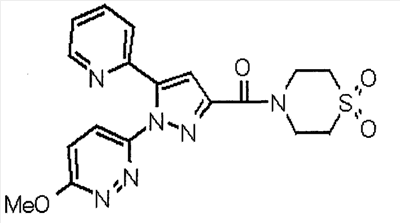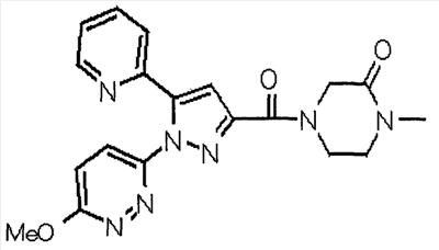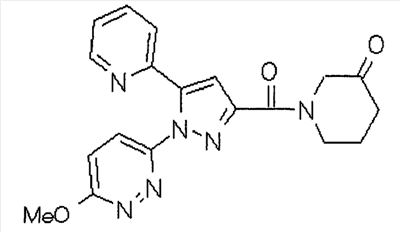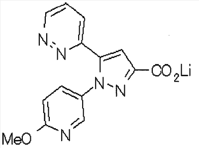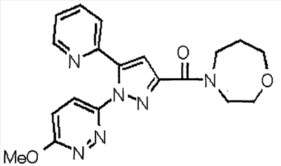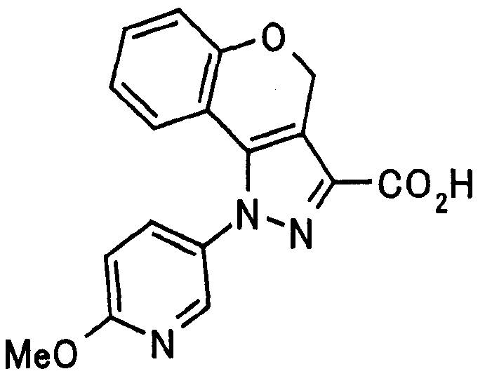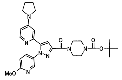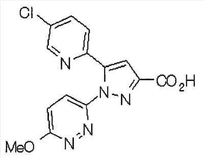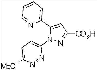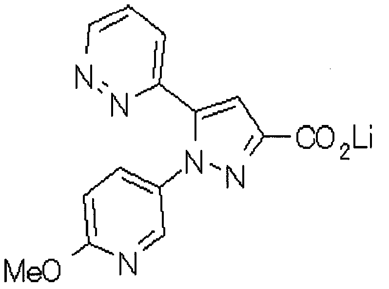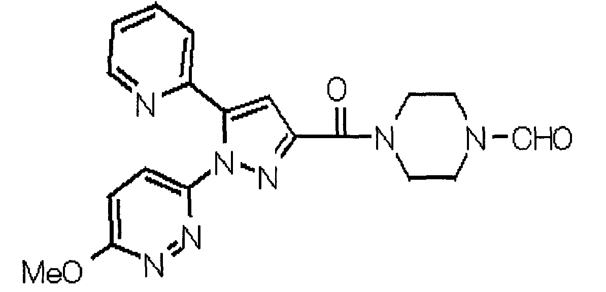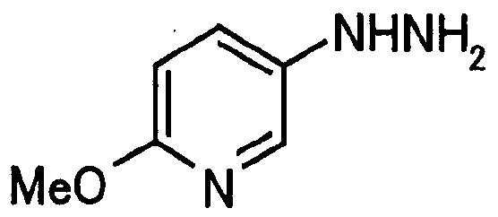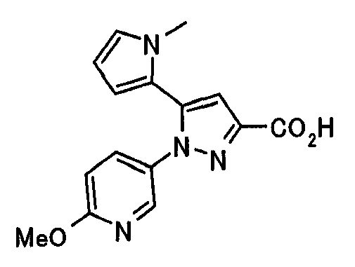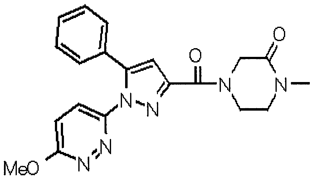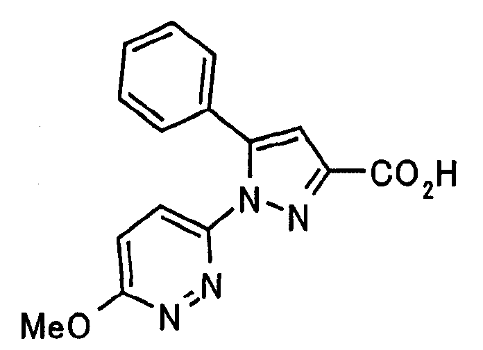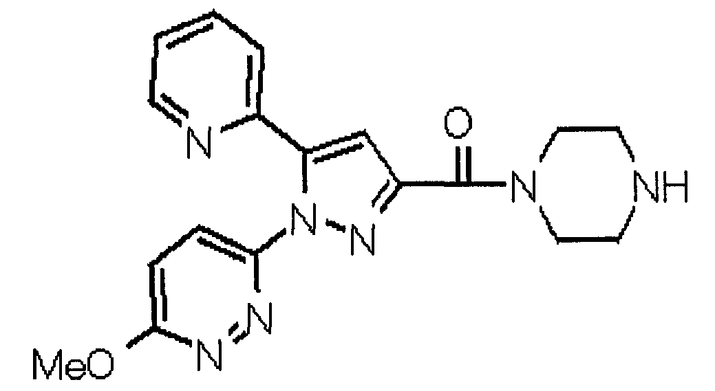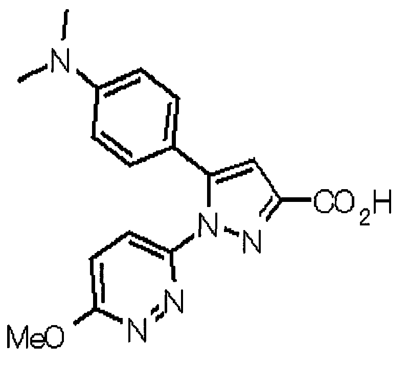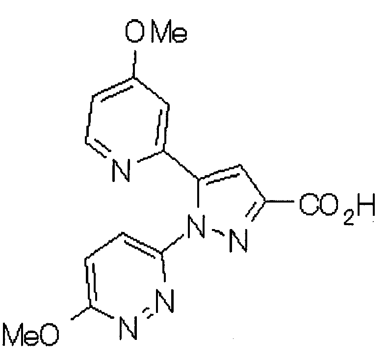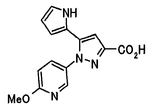 1) Дибензиловый эфир 1,2,3,6-тетрагидропиридазин-1,2-дикарбоновой кислоты Общую процедуру ссылочного примера 151-3) повторяют с применением дибензилового эфира 1,2-азодикарбоновой кислоты (10,28 г), получая при этом дибензиловый эфир 1,2,3,6-тетрагидропиридазин-1,2-дикарбоновой кислоты в виде маслянистого продукта (2,57 г, 21%). 1Н-ЯМР (400 МГц, CDCl3) FAB-МС m/z: 353 (М+H)+. 2) Указанное в заголовке соединение Общую процедуру ссылочного примера 151-4) повторяют с применением полученного выше дибензилового эфира 1,2,3,6-тетрагидропиридазин-1,2-дикарбоновой кислоты (2,57 г), получая при этом указанное в заголовке соединение в виде маслянистого продукта (0,629 г, количественный выход). 1Н-ЯМР (400 МГц, ДМСО-d6) ESI-МС m/z: 87 (М+H)+. [Ссылочный пример 157] Гидрохлорид 1-метилпиперазин-2-она 4 н. HCl-диоксан (20 мл) добавляют к трет-бутиловому эфиру 3-оксопиперазин-1-карбоновой кислоты (2,06 г), полученному в ссылочном примере 90, с последующим перемешиванием при комнатной температуре в течение 1 часа. Растворитель реакции удаляют при пониженном давлении, получая при этом указанное в заголовке соединение в виде маслянистого продукта (1,44 г, 99%). 1Н-ЯМР (400 МГц, ДМСО-d6) ESI-МС m/z: 115 (М+H)+. [Ссылочный пример 158] 1-(6-Метокси-3-пиридазинил)-5-(4-метокси-2-пиридил)пиразол-3-карбоновая кислота 1) Этиловый эфир 1-(6-хлор-3-пиридазинил)-5-(4-метокси-2-пиридил)пиразол-3-карбоновой кислоты Общую процедуру стадии 1) способа А ссылочного примера 139 повторяют с применением этилового эфира 4-(4-метокси-2-пиридил)-2,4-диоксобутановой кислоты (4,94 г), полученного в ссылочном примере 17, и 3-хлор-6-гидразинопиридазина (2,84 г), получая при этом этиловый эфир 1-(6-хлор-3-пиридазинил)-5-(4-метокси-2-пиридил)пиразол-3-карбоновой кислоты в виде твердого вещества (2,02 г, 29%). 1Н-ЯМР (400 МГц, CDCl3) EI-МС m/z: 359 (М+). 2) Указанное в заголовке соединение Водный 1 н. гидроксид натрия (14 мл) добавляют к полученному выше этиловому эфиру 1-(6-хлор-3-пиридазинил)-5-(4-метокси-2-пиридил)пиразол-3-карбоновой кислоты (2,01 г) в смеси метанола (40 мл) и тетрагидрофурана (40 мл) при комнатной температуре с последующим перемешиванием в течение 1 часа. Растворитель реакции удаляют при пониженном давлении и к остатку добавляют воду и смесь промывают хлороформом. Водный слой распределяют между уксусной кислотой (20 мл) и смесью растворителей метанол-хлороформ (1:5). Органический слой сушат над безводным сульфатом натрия с последующим фильтрованием. Растворитель удаляют при пониженном давлении и остаток растворяют в метаноле (14 мл). В атмосфере аргона к образовавшемуся раствору при комнатной температуре добавляют метоксид натрия (0,332 г) с последующим перемешиванием в течение 3 часов. Смесь кипятят с обратным холодильником при нагревании в течение 2 часов и затем охлаждают на воздухе. Реакционную смесь распределяют с применением уксусной кислоты (10 мл), воды и смеси растворителей метанол-хлороформ (1:10). Органический слой сушат над безводным сульфатом натрия с последующим фильтрованием. Растворитель удаляют при пониженном давлении, получая при этом указанное в заголовке соединение в виде твердого вещества (0,626 г, 34%). 1Н-ЯМР (400 МГц, ДМСО-d6) EI-МС m/z: 327 (М+). [Ссылочный пример 159] 1-(6-Метокси-3-пиридил)-5-(пиррол-2-ил)пиразол-3-карбоновая кислота При охлаждении льдом к этоксиду натрия (1,63 г) в этаноле (20 мл) добавляют диэтилоксалат (3,10 мл) и 1-[1-(фенилсульфонил)пиррол-2-ил]-1-этанон (2,49 г) с последующим перемешиванием при комнатн