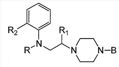 где R представляет собой атом водорода или т.п.; R1 представляет собой атом водорода или т.п.; R2 представляет собой атом галогена или т.п. и В представляет собой моноциклическую арильную группу или т.п. Структурной особенностью данного соединения является то, что он содержит N-фениламиноалкильную группу в качестве пиперазиновой боковой цепи.