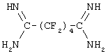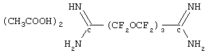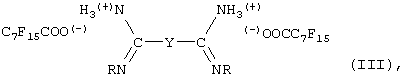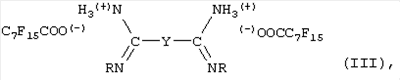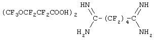 Например, в рамках настоящего изобретения применяются композиции, соответствующие формуле III, описываемые формулой CF3О(CF2)kСООН, где k – целое число от 1 до 10. Кроме того, пригодными являются композиции, в которых карбоксильное соединение имеет формулу CF3(CF2)jCOOH, где j – целое число от 1 до 15, предпочтительно от 1 до 8, и в некоторых случаях более предпочтительно от 1 до 3. Амидинсодержащие вулканизующие вещества, используемые в рамках настоящего изобретения, включают соединения, соответствующие формуле:
