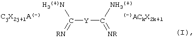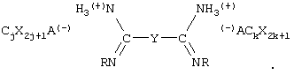 где j и k находятся в диапазоне от 1 до примерно 12, Y – связующая группа, причем Y факультативно СХ2ОСХ2, (СХ2ОСХ2)p или (СХ2СХ2)р, где р – целое число от 1 до 5, каждый Х независимо друг от друга Н, F или Cl, каждый из R независимо выбран из группы С6-С15 арил, алкарил или алкенарил, и где R является факультативно замещенным, а А – анион; или соответствующее формуле