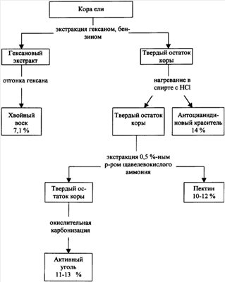 Способ переработки коры ели, включающий экстракцию коры неполярным растворителем с извлечением хвойного воска, последующее выделение из коры антоцианидинового красителя и переработку остатка коры в активный уголь, отличающийся тем, что после получения антоцианидинового красителя остаток коры подвергают экстракции 0,5%-ным водным раствором щавелево-кислого аммония при температуре 95-100°С с выделением пектина.