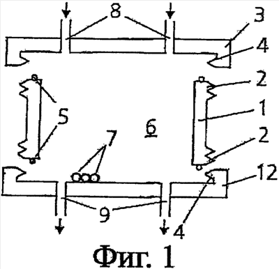 На фиг.5 показан разрез биореактора с верхней крышкой 3, нижней крышкой 12 и цилиндрической средней частью сосуда 1. Верхняя крышка 3 снабжена подвесным устройством в виде нескольких расположенных с распределением по окружности стержней 21, которые проходят параллельно продольной оси сосуда 1 внутрь сосуда 1. На нижнем конце стержней 21 закреплена платформа 22, на которой размещаются подлежащие выращиванию клетки 7. Подводящее отверстие 8 и отводящее отверстие 9 могут быть расположены в окружной стенке сосуда 1. Однако возможно также их расположение в одной из обеих крышек 3 или 12, как это показано штриховыми линиями. В этом случае также возможны отдельные соединительные отверстия для подачи и отвода.