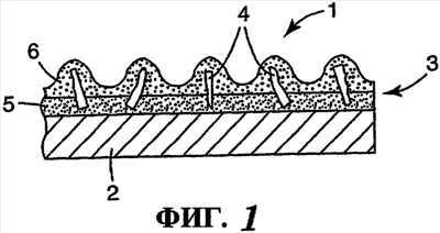 Пример покрытого абразивного изделия представлен на фиг.1. Согласно этому чертежу покрытое абразивное изделие 1, изготовленное в соответствии с предметом настоящего изобретения, имеет основу 2 и абразивный слой 3. Абразивный слой 3 содержит абразивные частицы 4, полученные способом, являющимся предметом настоящего изобретения, связанные с главной поверхностью основы 2 формирующим покрытием 5 и клеящим покрытием 6. В некоторых случаях используется дополнительное клеящее покрытие (не показано).
