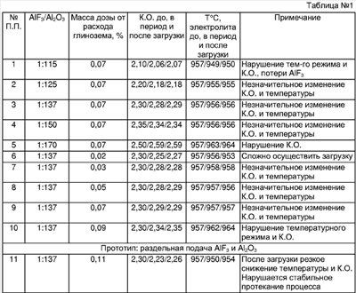 Изобретение относится к металлургии легких металлов, а именно к получению алюминия электролизом криолит-глиноземных расплавов из собранных в серию электролизерах, каждый из которых снабжен системой автоматической подачи глинозема (АПГ). В промышленных условиях питание электролизеров глиноземом осуществляют, транспортируя глинозем из силосов к электролизеру (один силос на 30-50 электролизеров) и выгружая его либо на корку (замерзший электролит на поверхности расплава), либо в бункера системы АПГ, и далее подавая его в расплав через выполненные в корке технологические отверстия. Способ с применением АПГ считается более перспективным, так как позволяет, загружая глинозем из бункеров в расплав малыми порциями, поддерживать его постоянную концентрацию в электролите. Кроме глинозема для стабилизации состава расплава и условий электролиза в электролизеры осуществляют периодическую загрузку других компонентов электролита, в частности фторида алюминия. В патенте РФ №2121529, 1998.11.10, С25С 3/14 при питании электролизеров глиноземом отверстия в корке поддерживают незарастающими посредством циклической работы пробойником, при этом создаются условия для истечения материала в расплав электролита. Недостаток способа заключается в необходимости использования двух дозаторов, отдельно для глинозема и корректирующих добавок, что не позволяет стабилизировать работу электролизеров по криолитовому отношению и температурному режиму. При использовании системы АПГ глинозем на корку не подается и смешение с ним фторида алюминия на корке становится невозможным. В этом случае подачу фторида алюминия производят непосредственно в электролизеры либо в количестве суточной дозы, либо небольшими порциями через дозаторы автоматической подачи фторида (АПФ), осуществляя индивидуальную регулировку состава каждого электролизера (В.Х.Манн и др. Цветные металлы, №14, 2000, с.95-101). Такой способ подачи ведет к возрастанию потерь фторида алюминия. В качестве прототипа по технической сущности и достигаемому результату принят способ, приведенный в описании к А.С. 712462, С25С 3/06 от 04.04.78, согласно которому глинозем и фторид алюминия перемешивают в межкорпусных силосах, причем отношение фторида алюминия к глинозему составляет от 1:100 до 1:67. Далее полученную шихту можно подавать на электролизеры описанными выше способами. При таком способе приготовления шихты, очевидно, происходит усреднение количества фторида алюминия, подаваемого на электролизер, что не позволяет осуществлять индивидуальную регулировку состава каждого электролизера. Как показывает опыт, для индивидуальной регулировки на не менее чем 30% электролизеров после загрузки шихты, полученной по А.С. 712462, необходима последующая нейтрализация избыточно введенного фторида алюминия содой либо вторичным криолитом. Техническим результатом изобретения является поддержание постоянных значений криолитового отношения (К.О.) и температуры электролита при питании электролизеров системой АПГ. Технический результат достигается за счет того, что в способе питания алюминиевых электролизеров глиноземом и фторидом алюминия, включающем предварительное получение смеси глинозема с фторидом алюминия и ввод этой смеси через технологическое отверстие в корке электролизера, смесь готовят в соотношении глинозе