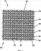 Обращаясь снова к фиг.1, отметим, что матрица 16 пьезоэлектрических форсунок, начиная от края основы-подложки 12 или – что предпочтительно – от опорной нити, проходящей в направлении ее длины, совершает поступательное движение в продольном и поперечном направлениях над основой-подложкой 12, а когда основа-подложка 12 находится в покое – осаждает материал полимерной смолы в виде исключительно маленьких капель, имеющих номинальный диаметр 10 мкм (10 микрон) или более, например 50 мкм (50 микрон) или 100 мкм (100 микрон), в виде одного из вышеописанных рисунков. Поступательным движением матрицы 16 пьезоэлектрических форсунок в продольном и поперечном направлениях относительно основы-подложки 12 и осаждением капель материала полимерной смолы из каждой пьезоэлектрической форсунки в матрице 16 контролируемым образом управляет компьютер, вследствие чего является управляемой в трех плоскостях – по длине, ширине и глубине или высоте (то есть, по размерам х, у, z или в соответствующих направлениях) – геометрия рисунка, формируемого компьютером для повторного нанесения с целью наращивания желаемого количества материала – с достижением желаемой формы материала полимерной смолы – на единицу площади основы-подложки 12.