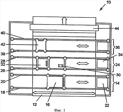 На третьей станции – станции 36 отверждения по выбору – поперечные направляющие 38, 40 служат опорой устройству 42 отверждения, которое может потребоваться для отверждения используемого материала полимерной смолы. Устройство 42 отверждения может быть источником инфракрасного излучения, горячего воздуха, микроволнового излучения или лазерным источником, холодным воздухом либо источником ультрафиолетового или видимого света, причем выбор определяется требованиями используемого материала полимерной смолы.