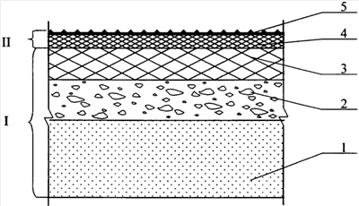 Дорожная одежда состоит из слоев основания I и покрытия II. Основание включает дренирующий слой 1, щебень из слабопрочного известняка или гравия 2 и крупнозернистый асфальтобетон 3. Покрытие состоит из битумокерамзитовой композиции 4 и слоя поверхностной обработки из черного щебня-клинца 5 крупностью до 10 мм.