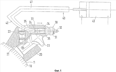 На фиг.3 показан участок фрезерного барабана 10. Фрезерный барабан 10 имеет трубу фрезерного барабана, которая образует поверхность 11 барабана. В трубу фрезерного барабана непосредственно введены гнезда 24 для приема резцов, так что резцедержатели 23 монолитно связаны с трубой фрезерного барабана. Гнездо 24 для приема резца образовано отверстием. Оно снабжено на своем одном конце отверстия расширением 26 отверстия, которое облегчает вставку резца 30. На другом конце отверстия расположено приспособление 40 для замены инструмента. Оно может быть выполнено в виде гидравлического или пневматического цилиндра и иметь перемещаемый линейно извлекающий стержень 42. Само собой разумеется, приведенное на фиг.3 устройство для замены инструмента может использоваться также на любой другой системе резцедержателей, в частности в системе замены держателя, как это представлено на фиг.1 и 2. В гнездо 24 для приема резца вставлен резец 30. Он соответствует по типу конструкции резцам 30, показанным на фиг.1 и 2.