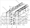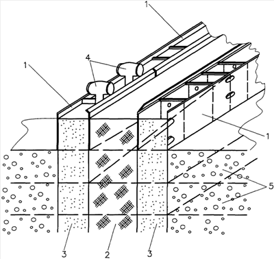На чертеже показаны сквозные, без днищ, инвентарные металлические кассеты 1, водоупорный элемент 2 противофильтрационной диафрагмы из асфальтобетона или глинистого материала, переходные слои-фильтры 3 из фракционированного сыпучего материала, навесные вибраторы 4 на внутренних перегородках опалубочных металлических кассет 1, слои насыпи 5 боковых призм плотины из грунтового материала.