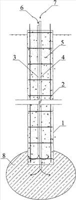 В результате прокачки укрепляющего раствора происходит уплотнение и упрочнение бетонной смеси ствола сваи. Прокачка раствора 7 приводит к закреплению грунта основания сваи 8.