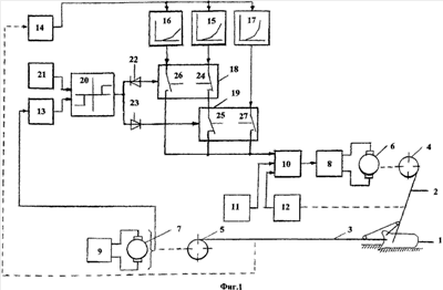 При перемещении ковша по забою с помощью нелинейного элемента 20 производится сравнение выходных сигналов задатчика 21 и датчика 13 пути копания. Если величина отклонения между выходными напряжениями задатчика 21 и датчика 13 пути копания меньше допустимого значения ± U21-13<± Uдоп и, следовательно, величина отклонения между заданным и текущим значением пути копания также меньше допустимой величины ± lк<± lк.доп, то сигнал на выходе нелинейного элемента 20 принимает нулевое значение. При этом сигнал на управляющих входах ключей 18 и 19 также равен нулю, и они находятся в положении, когда их контакты 24 и 25 замкнуты, а контакты 26 и 27 – разомкнуты. В результате к третьему входу регулятора 10 натяжения подъемных канатов подключается основной функциональный преобразователь 15, и регулирование натяжения подъемных канатов осуществляется на основании сигналов задания, сформированных этим преобразователем. При этом осуществляется управление процессом копания, обеспечивающее формирование забоя с постоянной толщиной стружки грунта.