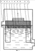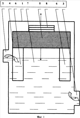 На фиг.2 изображено предложенное устройство коалесцентно-сорбентного фильтра для очистки жидкости от нефтепродуктов, содержащихся в ливневых сточных водах, в активной фазе работы фильтра. На фиг.2 изображен проточный сосуд (1) с приемным (2) и выпускным (3) патрубками. Сосуд содержит корпус сорбентного фильтра (4) с сорбентом (5), опирающийся на поплавки (6). Корпус сорбентного фильтра (4) с сорбентом (5) и поплавками (6) погружен в верхнюю часть слоя жидкости (7), представляющего собою образовавшийся при прохождении сточных вод, содержащих нефтепродукты, – коалесцентный фильтр (9). Уровень погружения корпуса сорбентного фильтра (4) урегулирован регулятором веса (8) сорбентного фильтра, выталкивающей силой поплавков (6) и плотностью жидкости коалесцентного фильтра (9), которая меньше удельного веса жидкости, не содержащей нефтепродукты в пассивной фазе работы фильтра, представленного на фиг.1.
