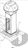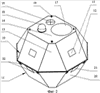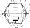На фиг.3 показана во фронтальном сечении смотровая кабина 9, смонтированная из двух куполообразных частей 10 и 11. Верхняя часть 10 состоит из разнесенных куполообразных слоев 25 и 26, приваренных к общему основанию 27. К внутреннему слою 25 прикреплены распорки 28, удерживающие на расстоянии внешний слой 26 относительно внутреннего слоя 25. Слои 25 и 26 состоят из четырех прямоугольных, четырех трапециевидных и одной восьмиугольной секций, скрепленных между собою сторонами и углами при помощи сварки. Между внешним слоем 26 и внутренним 25 воздушная полость заполнена окатышами металлургического производства 29.