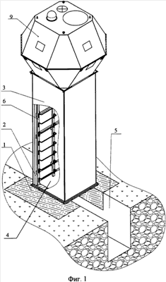 Как показано на фиг.1, наблюдательная вышка смонтирована на фундаменте 1. К монтажным отверстиям (на фиг.1 не показано) фундамента 1 жестко прикреплена опора 2, обшитая листовым металлом 3, имеющая замаскированный вход 4, подход к которому соединен с окопом 5, по которому часовой незаметно может подойти к опоре 2. Внутри опоры 2 от входа 4 вверх ведет лестница 6 до герметичного люка входа-выхода 7 (на фиг.3), находящегося в нижней грани 8 (на фиг.3) смотровой кабины 9. Смотровая кабина 9 жестко прикреплена к опоре 2.