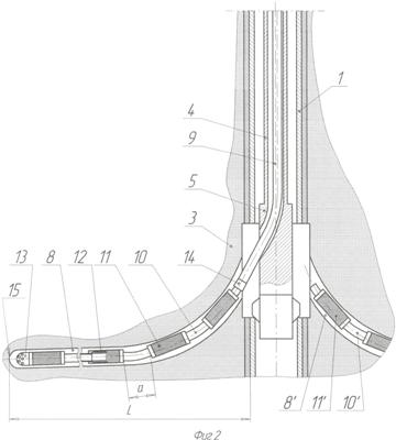 Таким образом, с помощью поворота отклонителя 5 посредством колонны труб 4 с устья скважины последовательно вводят в технологические каналы 8″……8n соответствующие гибкие сочленения 10″……10n, спускаемые на дополнительной колонне труб 9 с соответствующими фильтрами 11″……11n, отверстия которых перекрыты кислоторастворимым материалом 12″……12n и дополнительными соплами 13″……13n на конце в продуктивном пласте 3 до упора в концы 15″……15n соответствующих технологических каналов 8″……8n. После размещения гибких сочленений 10″……10n во все соответствующие технологические каналы 8……8n в них закачивают кислоту (например, соляную), которая растворяет кислоторастворимый материал 12……12n фильтров 11……11n гибких сочленений 10……10″ и образует гидравлическую связь между продуктивным пластом 3 и внутренним пространством гибких сочленений 10……10n обсадной колонны 1.
