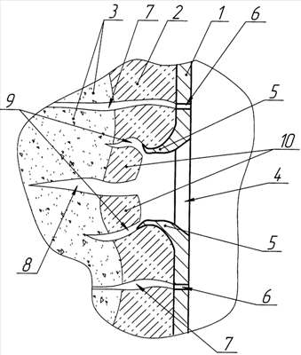 В обсадные колонны 1 (наружный 146 мм) скважин, закрепленных цементным камнем 2, в интервал продуктивного пласта 3 (толщиной 4 м и 6 м) спускают соответственно в каждый в свою скважину перфоратор гидромеханический ПГМ-146 и на канате перфоратор гидромеханический ПГМ-К-146. После чего производят соответственно восемь и двенадцать (четыре установки ПГМ-146 и шесть установок ПГМ-К-146 через 80-100 см) отверстий 4 (площадью сечения 4,5÷5 см2 каждое, в зависимости от толщины стенки и изгиба обсадной колонны) в обсадной колонне 1 с образованием заусенец 5 сверху и снизу отверстий 4. Затем ПГМ-146 и ПГМ-К-146 извлекают из скважин, спускают перфоратор (например, кумулятивный перфоратор ПК – 105С) взрывного типа (на чертеже не показан), при помощи которого производят дополнительные отверстия 6 в осадной колонне с плотностью перфорации – восемнадцать дополнительных отверстий 6 на один погонный метр обсадной колонны 1 в интервале продуктивного пласта 3. Под действием перфоратора взрывного типа образовались каналы 7 и 8 в цементном камне 2 и продуктивном пласте 3, причем каналы 8 значительно увеличили проникновение отверстий 4 непосредственно в продуктивный пласт 3 и перераспределили внутрискважинное давление в радиальном направлении, значительно его уменьшая (до 120-140 атм, что более чем в 2 раза ниже, чем в прототипе). Наличие заостренных заусенец 5 сыграло роль концентратора напряжений и гасителя механических волн, распространяемых по обсадной колонне после перфорации взрывом, что образовало дополнительные каналы 9 в зоне заусенец 5, исключая практически отслоение обсадной колонны 1 от цементного камня 2 выше и ниже интервала вскрытия (данные получены экспериментальным путем). После чего кумулятивный перфоратор (исключая воздействия на него породоразъедающим раствором) извлекают из скважины, а продуктивный пласт при необходимости (слабопроницаемый пласт) обрабатывают породоразъедающим раствором, воздействие которого более эффективно, чем в прототипе, из-за большей площади воздействия на продуктивный пласт 3 и из-за исключения его разрушения и испарения под действием высоких температур. Участки 10 цементного камня 2 в процессе обработки породоразъедающим раствором (например, 20% водный раствор соляной кислоты) и в процессе эксплуатации пласта разрушаются, увеличивая вскрытую площадь продуктивного пласта 3, что улучшает условия эксплуатации продуктивного пласта 3.
