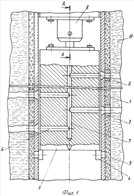 В скважине находится обсадная труба 1, в стенке которой выполнены конические отверстия 2, защищенные кольцами 3, закреплены опоры 4; между обсадной трубой 1 и пластом 10 находится слой бетона 9. Внутри обсадной трубы 1 размещается корпус 5 секции перфоратора, имеющий горизонтальные отверстия 6 и вертикальные осевые отверстия 7.