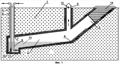 Шахтное подземное хранилище в многолетне-мерзлых породах 1 состоит из основной тоннельной выработки 2, наклонной выработки 3, эксплуатационной 4 и технологической 5 скважин. Основная тоннельная выработка 2 выполнена с подъемом в сторону технологической скважины 5, при этом угол ее наклона не превышает величины, при которой абсолютная отметка почвы 6 тоннельной выработки 2 в зоне размещения технологической скважины 5 не превышает абсолютной отметки ее кровли 7 в зоне расположения эксплуатационной скважины 4. В эксплуатационной скважине 4 размещены труба 8 для приема продукта хранения и труба 9 для его отбора, в которой установлен погружной насос 10. В почве 6 тоннельной выработки 2 на участке размещения эксплуатационной скважины 4 выполнен зумпф 11. Технологическая скважина 5 оборудована дыхательным клапаном 12, через который происходит вытеснение воздуха из шахтного хранилища при его заполнении продуктом хранения 13. По окончании строительства наклонную выработку 3 с поверхности герметизируют послойно намораживаемым водопесчаным раствором 14.