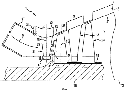 Платформа 33 направляющей лопатки 21 и платформа 43 рабочей лопатки 23 образуют при этом соответственно часть ограничения 49, 51 канала течения 5 для рабочей среды М, которая протекает через газовую турбину 1. Периферийное ограничение 49 является при этом частью периферийного корпуса турбины 15. Ограничение 51 на стороне ротора является при этом частью вращающегося в режиме эксплуатации газовой турбины 1 ротора турбины 19.
