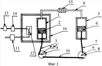 Кроме того, двигатель внешнего нагревания содержит группу трубок 9, соединяющих попарно холодные 5 и горячие 1 цилиндры и содержащих устройство 15 регенерации тепла, трансмиссию 10, соединяющую коленчатый вал 4 горячей группы с коленчатым валом 8 холодной группы, теплоизоляцию 16, топливный насос 11, камеру сгорания 12, компрессор 13 подачи воздуха в камеру сгорания и теплообменник 14.