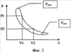 Для характеристики условия сохранения изотермического процесса расширения-сжатия рассмотрим диаграмму «давление Р – объем V», представленную на фиг.2.