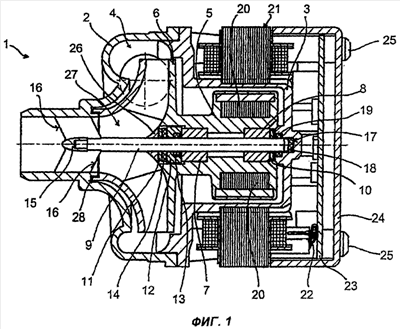 Снаружи чашеобразного щита 3 расположен статор 21 двигателя с мокрым ротором, так что в данном случае имеет место так называемый внутренний ротор. Конструктивный вариант с наружным ротором также возможен. Электрическое подключение статора 21 выполнено в форме подпружиненного контакта 22 со схемой управления, расположенной на плате 23. Это позволяет производить сборку насоса 1 без применения специального паяльного инструмента. Плата 23 закрыта задней крышкой 24 корпуса, соединенной винтами 25 со статором 21 и чашеобразным щитом 3.