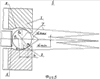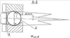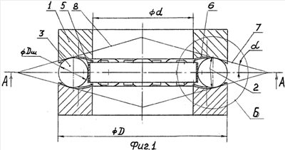 При передаче осевой нагрузки упорным подшипником опорные кольца 1 взаимодействуют с шарами 3 в точке а2 касания касательной 7 к образующей 6 рабочих поверхностей 2 под углом “ “, равным углу при основании конуса 8. Этот угол “ ” при работе упорного подшипника постоянно меняется от “ “max так до “ “min и изменяет мнимый конус 8 по форме и по размерам.