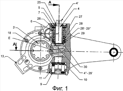 c) стопорный механизм одностороннего действия, образованный между стопорными поверхностями 28′-29″ стопорной втулки 28 одностороннего действия и седла 29 стопора/сцепления одностороннего действия, взаимодействующего с червячным валом у зубьев 4″-29′, и другим концевым участком стопорной втулки 28 одностороннего действия, которая соединена с червячным колесом 6 регулятора посредством прорезей на поверхностях и с помощью стопорной пружины 27 одностороннего действия, предназначен для реагирования на чрезмерный клиренс у колодок в связи с наличием износа и осуществляет его автоматическое регулирование. Все эти детали зафиксированы с помощью стопорного кольца 30 на нажимной втулке 26 для устранения возможности поверхностного перемещения зубьев седла 29 стопора/сцепления одностороннего действия по червячному валу 4 при разобщении сцепления и для облегчения изготовления узла и его технического обслуживания;