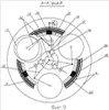 Особенностью работы второго варианта выполнения передачи (фиг.5, фиг.6) в сравнении с первым вариантом выполнения является то, что для начала движения транспортного средства при вращении вала 1 выбирается направление движения, например, вперед. При этом муфта 36 с помощью вилки 37 перемещается в сторону муфты 34, закрепленной на водиле 10, и обеспечивается связь водила 10 с выходным валом 32. Эпицикл 5 свободно вращается, опираясь, например, на подшипники, установленные между ним и корпусом 4 за счет фрикционной передачи вращения дисками 2,3 и 11. Тормозом 6 осуществляют торможение эпицикла 5 (см. фиг.12), и крутящий момент с вала 1 через фрикционные диски 2, 3 и 11 передается водилу 10, а от него к выходному валу 32.