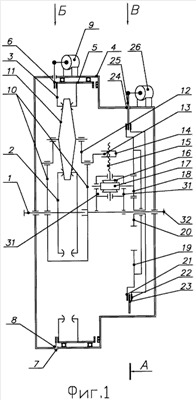 При выполнении устройства по первому варианту (фиг.1) направление движения только одно – вперед. Для троганья с места диском тормоза 6 тормозят и останавливают эпицикл 5 (см. фиг.4), и через систему фрикционных дисков 2-3-11 происходит передача вращения водилу 10, а следовательно, выходному валу 32. При необходимости изменения передаточного отношения вариатора диском 23 тормозится тормозной элемент 21 или 22, шестерни 18, центры которых вращаются вместе с водилом 10, с помощью гаек 14 и винтов 15 начинают обкатываться вокруг колеса 19 с внутренним зацеплением или 20 – с внешним зацеплением соответственно. Вращающиеся от шестерен 18 червяки 17 приводят во вращение червячные колеса 16, а те, в свою очередь, винты 15, которые перемещают вдоль своих осей гайки 14, поворачивающие поворотные рычаги 12, смещающие сателлиты 11 в радиальном направлении, например приближая их к центру или отдаляя от него, что изменяет передаточное отношение вариатора. Такое положение сателлитов 11, поворотных рычагов 12 и гаек 14 показано на фиг.2 штриховой линией. Для сохранения и фиксации передаточного отношения вариатора диск 23 устанавливается в нейтральное положение (фиг.5), и тормозные элементы 21 и 22 вращаются свободно, не изменяя положения гаек 14 на винтах 15.