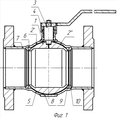 Шаровой кран включает шар 1 (шаровую пробку) крана, окружающий его корпус 2 крана, и штревельный узел 3 со своим корпусом 4. Корпус 2 крана симметричен относительно вертикальной оси и имеет в центральной части 5 шарообразную форму, соразмерную с поверхностью шара 1 внутри корпуса 2, переходящую с каждой из сторон через небольшой ступенчатый скос 6 в цилиндрическую трубчатую поверхность 7. При этом относительно вертикальной оси корпус 2 крана выполнен из двух симметричных отдельных частей 2 и 2 , а относительно горизонтальной оси корпус 2 выполнен как одно целое с цилиндрическими трубчатыми поверхностями 7 и 7 . Корпус 4 штревельного узла 3 посредством сварки установлен на цилиндрическом кольце 8, соразмерном с корпусом 2 крана. Между шаром 1 крана и корпусом 2 под ступенчатыми скосами 6 и 6 последнего установлены последовательно от шара 1 к корпусу 2 в углублениях (на чертеже не обозначены) последнего уплотняющее кольцо 9 затвора из неметаллического материала и посредством сварки упорное кольцо 10 из металла.