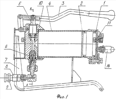 Подготовка и работа устройства осуществляется в следующем порядке: гибкий рукав 14 (фиг.2) отсоединить от обратного клапана 12 (фиг.2), цилиндр 4 (фиг.1) вместе с крышкой 1 (фиг.1), гибким рукавом 14 (фиг.2) и поршнем 2 (фиг.1) выкрутить из корпуса 10 (фиг.1). При этом поршень 2 (фиг.1) должен быть в крайнем левом положении в цилиндре 4 (фиг.1). Подсоединить гибкий рукав 14 (фиг.2) к обратному клапану 13 (фиг.2). Придать возвратно-поступательное движение рычагу 3 и плунжеру 5 (фиг.1). В результате отсасывания воздуха из цилиндра 4 (фиг.1) через обратный клапан 13 (фиг.2) и гибкий рукав 14 (фиг.2) поршень 2 (фиг.1) начинает перемещаться внутрь цилиндра 4 (фиг.1). По мере перемещения поршня 2 заполнить цилиндр 4 (фиг.1) смазкой. Отсоединить гибкий рукав 14 от обратного клапана 13 (фиг.2). Закрутить цилиндр 4 со смазкой в корпус 10 (фиг.1) до упора. Подсоединить гибкий рукав 14 к обратному клапану 12 (фиг.2), придавая возвратно-поступательное движение рычагу 3 и плунжеру 5, подать смазку через обратный клапан 6, гибкий рукав 8 и штуцер 9 (фиг.1) к поверхности трения. При этом устройство можно установить при помощи подставки 7 (фиг.1) в любое удобное для работы положение (горизонтальное или вертикальное). Излишек воздуха в цилиндре 4 удаляется через предохранительный клапан 11 (фиг.1).