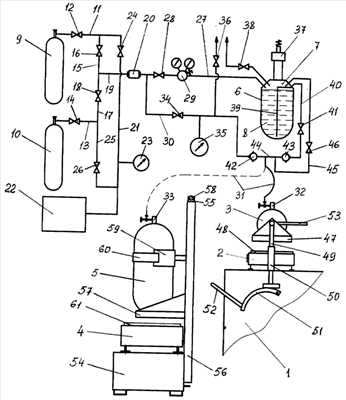Аналогичным образом заполняют сжиженным газом крупногабаритный баллон 5, установленный на платформе 57 измерительного весового устройства 4, в котором используются электронные весы мод. ВТ-60 с пределом взвешивания 0,5…60 кг. Для этого платформу 57 устанавливают над чашей весов 61 в верхнем положении посредством вращения ходового винта 55 за ручку 58 и вертикального перемещения стойки 56, которую с платформой 56 закрепляют фиксаторами в горизонтальном и верхнем положениях. В базовое гнездо платформы 57 устанавливают пустой баллон 5 и закрепляют на ложементах 59 и хомутами 60, а на горловину баллона 5 устанавливают запорный клапан 33, к которому присоединяют гибкий трубопровод 31.