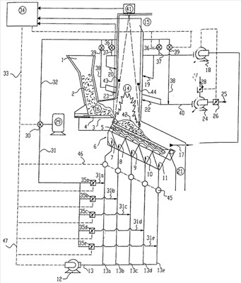Из установки 29 для разложения воздуха чистый кислород по транспортному и распределительному устройству 30 транспортируется, с одной стороны, по трубопроводу 21 для смешивания с первичным газом горения и, с другой стороны, по трубопроводу 32 для смешивания со вторичным газом горения. Соответствующее указание по регулированию поступает по магистрали 33 от центрального и комбинированного блока 34 управления и обработки данных, задача которого будет более подробно описана ниже. Через трубопровод 31 осуществляется подача кислорода в ответвительные трубопроводы 31а-31е, которые контролируются клапанами 35а-35е, которые, в свою очередь, управляются блоком 34 управления и обработки данных. Подводящие трубопроводы 31а-31е выходят в ответвительные трубопроводы 13а-13е, которые ответвляются от трубопровода 13 для окружающего воздуха и ведут к отдельным камерам 7-11 для дутья под колосниковую решетку.