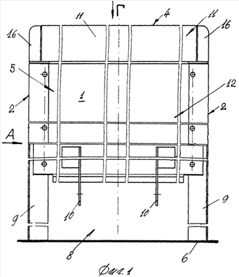 Кожух выполнен из отдельных соединенных между собой верхней части 11, нижней части 12 и, по крайней мере, одной средней части 13. Все части кожуха соединены между собой таким образом, что смежные элементы этих частей кожуха образуют собой вышеуказанные стенки кожуха. Названные части кожуха включают отбортовки 14 (фиг.2), которые скреплены с элементами кожуха заклепками 15 или другими аналогичными соединениями. Отбортовки 14 расположены внутри кожуха.