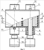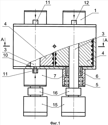1. Устройство для нагревания текучей среды, содержащее неподвижный корпус с цилиндрической полостью и расположенный с зазором в этой полости цилиндрический ротор, который жестко установлен на валу с возможностью вращения и имеет на цилиндрической поверхности определенное число неровностей или отверстий, а корпус имеет, по крайней мере, один впускной канал и выпускной канал, отличающееся тем, что в неподвижном корпусе выполнена вторая полость, соприкасающаяся с первой полостью, в которой, аналогично установленному ротору, расположен второй ротор на втором валу, причем роторы установлены с возможностью противоположного вращения от независимых приводных двигателей, кроме того, на цилиндрической поверхности каждого ротора последовательно размещены ряды глухих отверстий и прямоугольные пазы, меньшая сторона которых совпадает с радиусом ротора, пазы выполнены сквозными с выходом на торцы ротора, выпускной канал выполнен соосно с коническим отверстием, объединяющим цилиндрические полости, и размещен по центру корпуса.