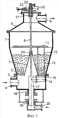 К нижней части вала 8 (фиг.1) жестко прикреплен стакан 17, который через сальник 18 выведен из газоподводящего короба 3. При этом сальник 18 являйся нижней опорой вала 8. Сальником 19 стакан 17 соединен с подводящим трубопроводом 20 вторичного теплоносителя. Промежуточной опорой вала 8 является подшипниковая пара трения 24, установленная в верхней части вытеснительного конуса 7. К стакану 17 в месте его соединения с валом 8, перпендикулярно его оси, подсоединен патрубок 14 подвода вторичного теплоносителя, имеющий по верхней образующей щелевое сопло 15, размещенное под газораспределительной решеткой 2 с зазором 0,5…1,0 мм. Вся система, состоящая из вала 8, траверсы 11, стакана 17 и патрубка 14, вращается в подшипниковом узле 21 и через пару конических зубчатых колес 22 и 23 соединена с приводом переменного числа оборотов (на чертежах не показан).