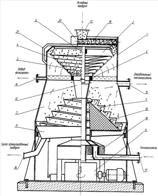 – размещение в вибросушилке перфорированного усеченного конуса с расположенным на его поверхности винтообразным желобом позволяет эффективно использовать преимущества знако-переменного движения продукта путем их равномерного распределения в зависимости от влажности по его каскадной поверхности, с целью увеличения эффективного контакта продукта с теплоносителем;