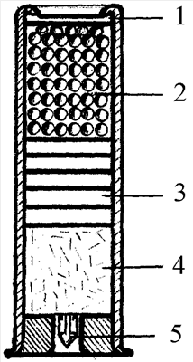 Патрон состоит из гильзы 1, снаряда дроби 2, обтюрирующего пыжа 3, изготовленного из материала «Изолон», представляющего собой однородные диски, заряда пороха 4 и капсюля-воспламенителя 5.