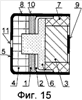 фиг.15 – пирогенератор, пятнадцатый пример исполнения (в аноде и электролитном материале есть отверстие, заполненное материалом сепаратора, а в пиротехническом составе есть углубление, заполненное материалом сепаратора);