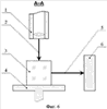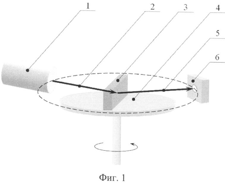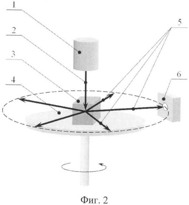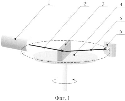 фиг.1 – принципиальная схема расположения составных частей установки для использования устройства [голографической призмы], модификация (А), где введены следующие, единообразные для всех фигур, обозначения: 1 – источник первичного излучения (референтный He-Ne лазер); 2 – референтный луч; 3 – голографическая призма (кристалл с голограммами); 4 – поворотное устройство сопряжения кристалла с углозадающей аппаратурой; 5 – дифрагированный луч, сформированный одной из голограмм; 6 – приемник излучения, индуцированного голограммой (ПЗС-матрица);