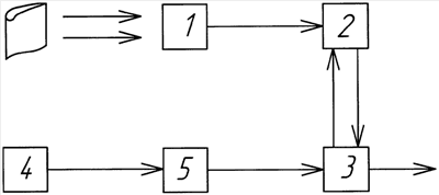 Фотоэлектрический преобразователь 1 преобразует пространственно-временное распределение температуры по траектории визирования рабочих лопаток турбины во временной электрический сигнал. При вращении рабочего колеса турбины, пятно визирования последовательно перемещается по поверхности всех лопаток, производя своеобразное сканирование. В результате сканирования образуется траектория визирования по всем лопаткам, которой соответствует временной электрический сигнал фотоэлектрического преобразователя 1. Процесс обработки сигналов начинается с момента поступления сигнала от магнитоиндукционного датчика положения лопаток 4 в микропроцессорную систему 3. Сигнал от магнитоиндукционного датчика положения лопаток 4 по форме близок к синусоидальной. Положительные полуволны сигнала преобразуется в прямоугольные импульсы. Условно принятый за первый импульс, поступая в микропроцессорную систему, сигнализирует о начале измерения температуры условно первой лопатки. По приходу импульса от магнитоиндукционного датчика положения лопаток 4 микропроцессорная система 3 запускает программу обработки данных. Микропроцессорная система 3 выдает сигнал запуска для аналого-цифрового преобразователя 2. Информация о температуре лопатки в виде напряжения определенной амплитуды поступает в аналого-цифровой преобразователь 2, который преобразует его в цифровой сигнал. Значение температуры первой лопатки считывается микропроцессорной системой 3. При этом организуется два программных счетчика: счетчик числа лопаток по сигналам с магнитоиндукционного датчика положения лопаток 4 (по приходу первого значения он уменьшится на 1) и счетчик числа оборотов турбины. После прихода условно первого импульса с магнитоиндукционного датчика положения лопаток 4 начинается цикл обработки данных: микропроцессорная система 3 определяет значение максимальной температуры отдельной лопатки, затем это значение записывается в одну из ячеек памяти, количество которых равно количеству лопаток. Далее микропроцессорная система 3 ожидает прихода следующего импульса от магнитоиндукционного датчика положения лопаток 4 (сигнализирующего о приходе условно второй лопатки) и соответственно определяет и записывает максимальную температуру второй лопатки. Значение, записанное в счетчике лопаток, численно равно количеству лопаток турбины двигателя. Когда количество поступивших импульсов от магнитоиндукционного датчика положения лопаток 4 станет равным количеству лопаток турбины, что соответствует одному обороту турбины, значение счетчика оборотов увеличится на 1. Далее цикл повторяется так, что максимальное значение температуры отдельной лопатки сравнивается с соответствующим ранее записанным в ячейку памяти значением температуры этой же лопатки и из них выбирается минимальное значение. После каждого оборота турбины происходит сравнение значения, записанного в программном счетчике числа оборотов с заранее заданным значением, которое задается исходя из длительности помех, частоты их появления, скорости изменения температуры лопатки. При достижении заданного числа оборотов полученные и записанные в памяти значения максимальных температур будут просуммированы и поделены на число лопаток. Кроме того, микропроцессорная система 3 выделяет 
