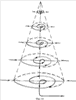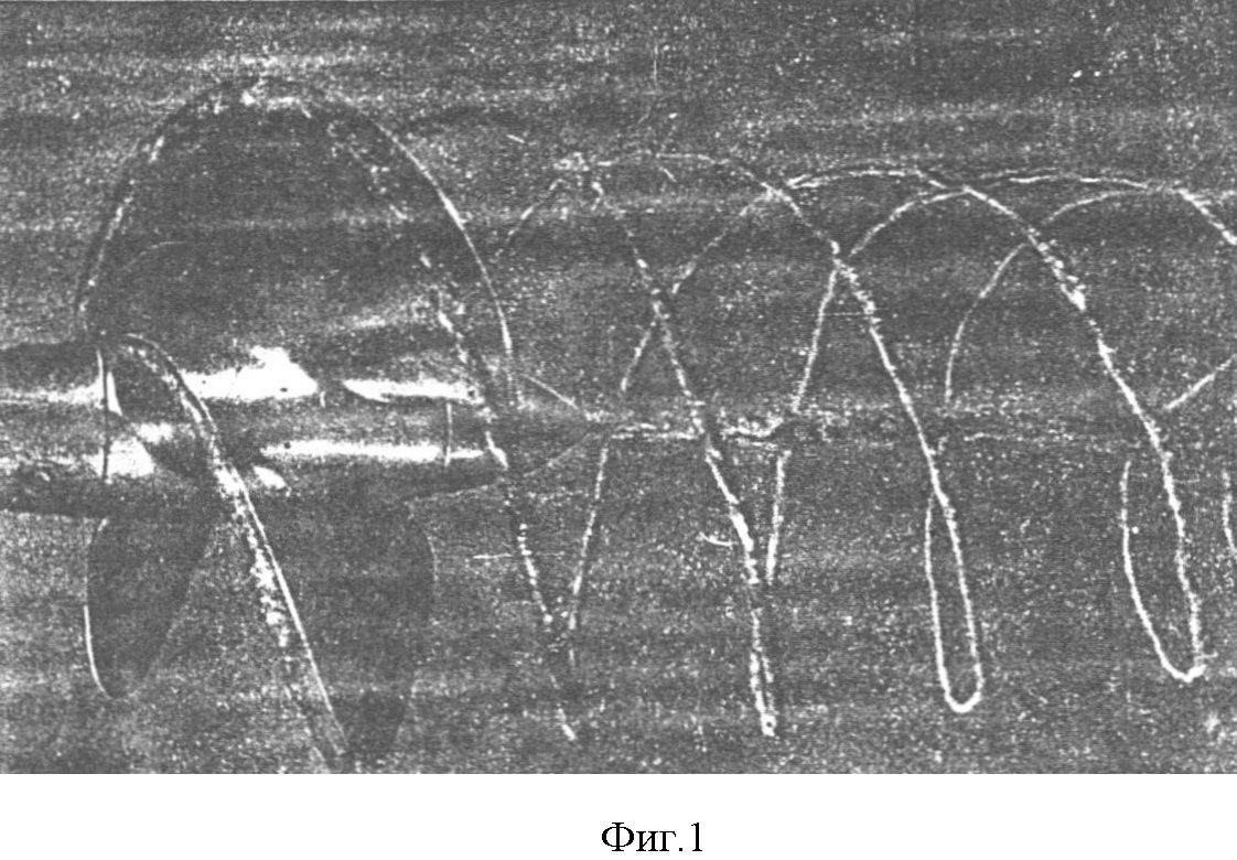 Другой особенностью потока среды за винтом является стабильность расположения в пространстве его оси и наименьшее взаимодействие с окружением, обусловленное вращением сходящих с лопастей жгутов (свободных вихрей, см. фиг.1 и 2, заимствованные из (4)). При этом жгуты-вихри вращаются вокруг своей оси и вокруг оси винта. Эта особенность может быть учтена в аналоге-соленоиде следующим образом: магнитопровод охватывается катушкой частично. Его неохваченная часть, значительная по длине, выдвинута назад (вниз по потоку) и имеет экран на боковой поверхности. Последнее перемещает северный полюс магнитного поля назад или исток диполя вниз по потоку. Дипольная модель винта представлена в изобретениях (10-16) за исключение последней особенности.