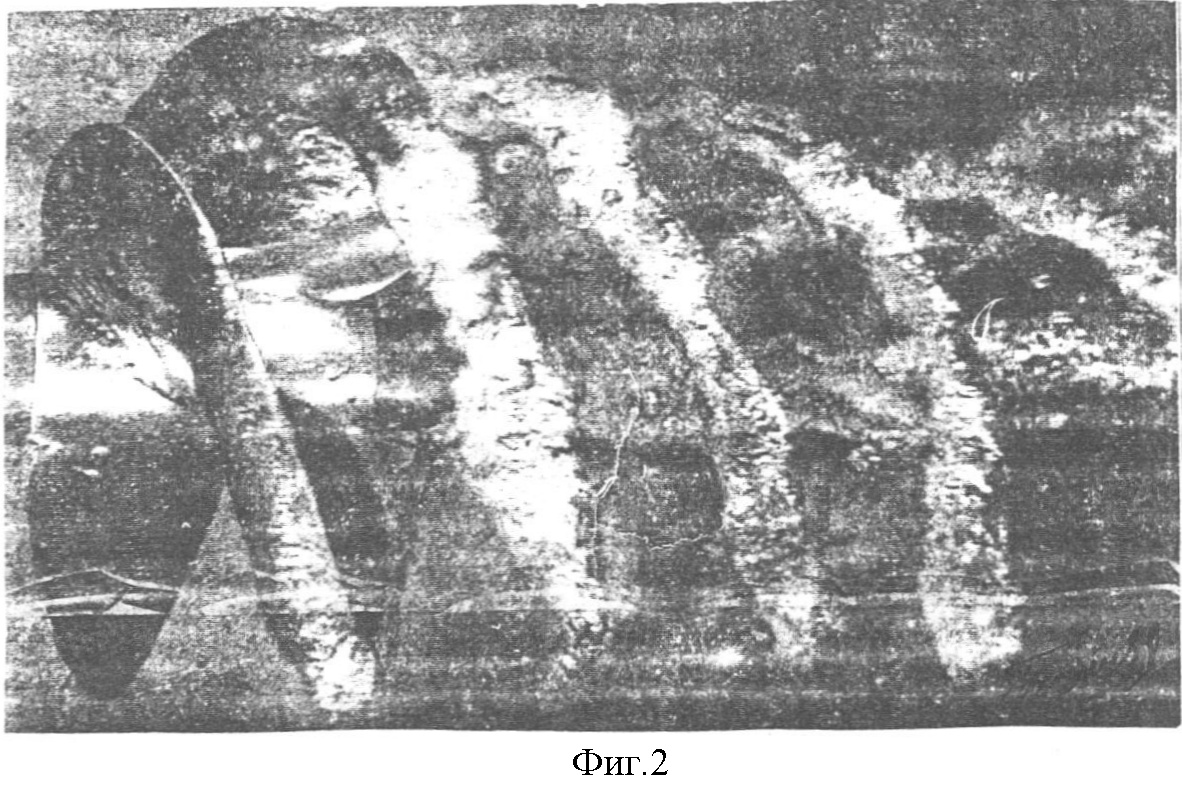 Всплытие ПТ также имеет место, и оно определяет угол расхождения ОТ, равный 1-3 град. Граница между ПТ и ОТ на начальном участке не просматривается, так как она находится на глубине, а верхнее пространство заполнено пузырьками. ПТ находится внутри ОТ. ПТ имеет меньшее количество пузырьков, так как центр области 1 расположен на большей глубине (сравни фиг.8 с фиг.3). Загиб концов РНВ, обусловленный направлением силовых линий поля, также имеет место.